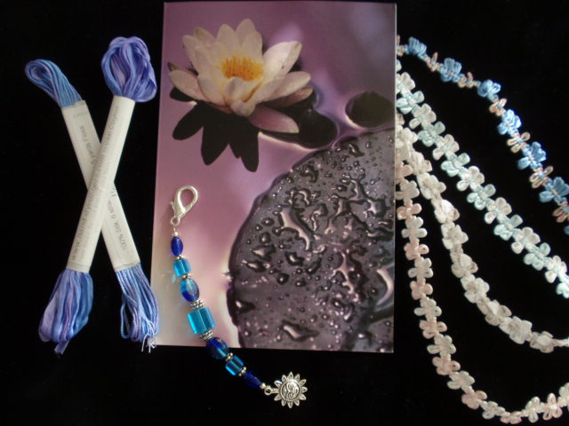I am SO thrilled… just look at the lovely gifts I received in the mail from Anne at Feather Stitching all the way from AUSTRALIA! She sent me the nicest card with such a pretty water lily on the cover with a beautiful and thoughtful note inside.