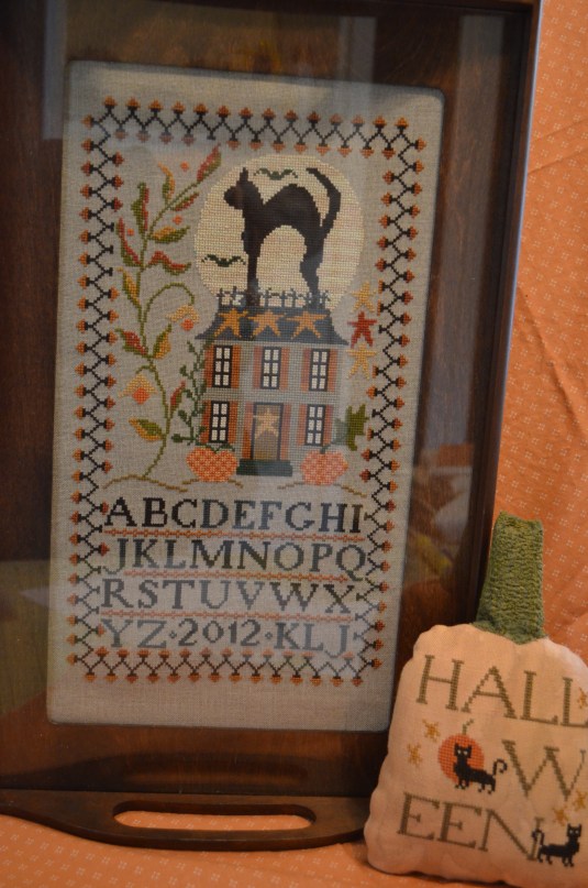 Being French, I do not really fall for Halloween fest. But your handiwork here is very cute. The alphabet panel seems to be glued to the tray…And it is quite a lot of your time in this crosstitching! Can I point out that your little scissors are appropriate and well matching the theme? I have never seen such scissors. Great picture!