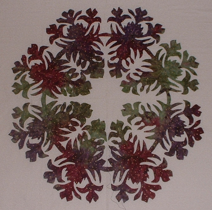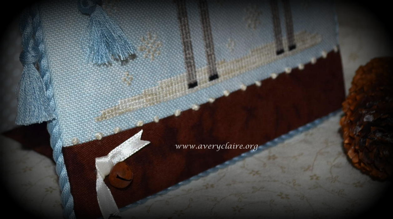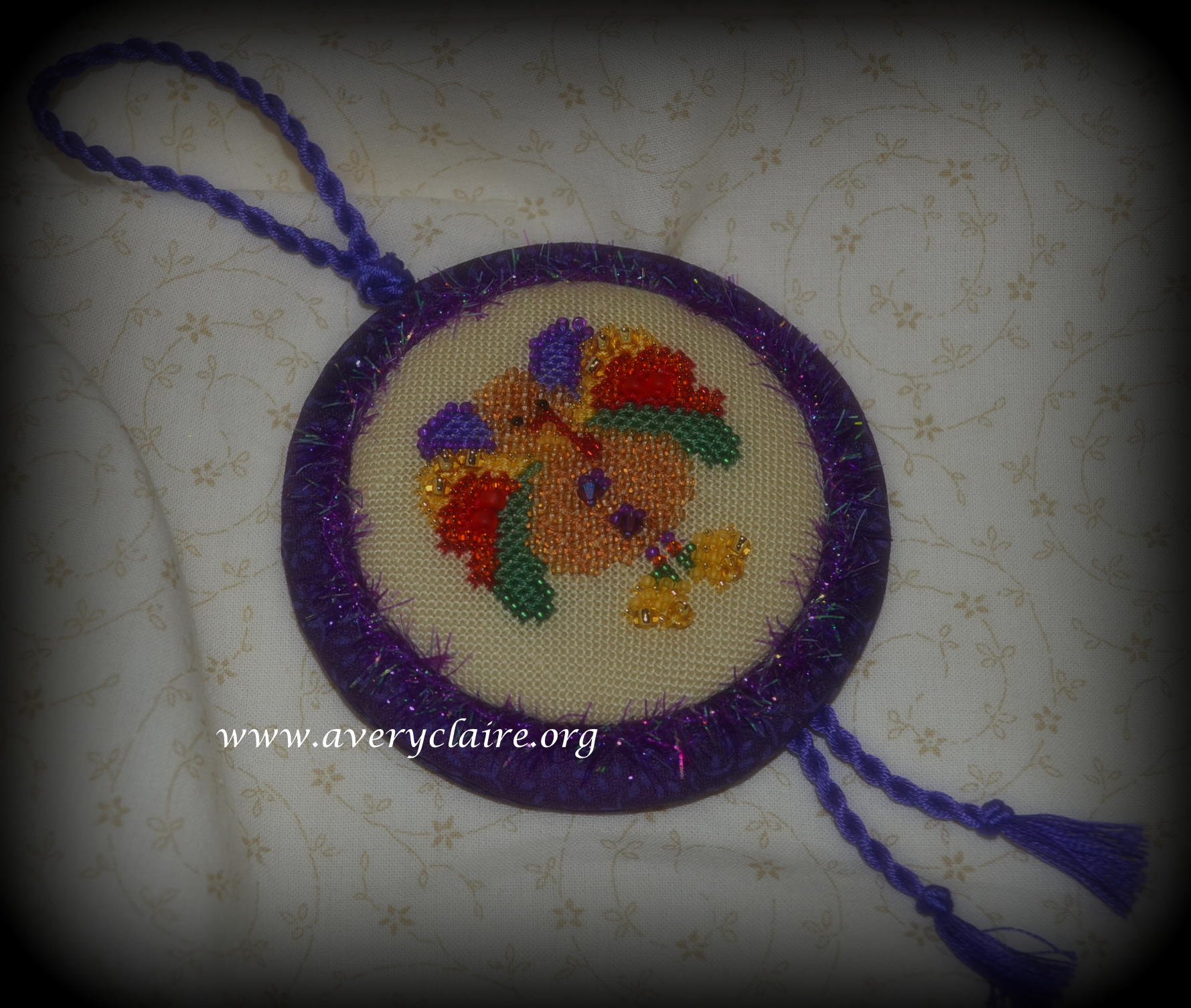Vivian is an extraordinary quilter, but loves to do cross-stitch too. This one is called “Deck the Halls” by Stacy Nash and was made into a pinkeep filled with walnut shells by Vivian. She asked me to attach the mini pom pom trim to it after it was finished, but I like it better within the seam allowance. So I took it apart and finished it with the trim in the seam. She loved it that way.