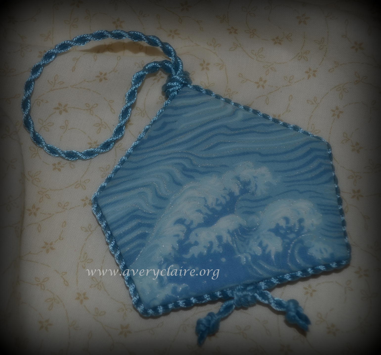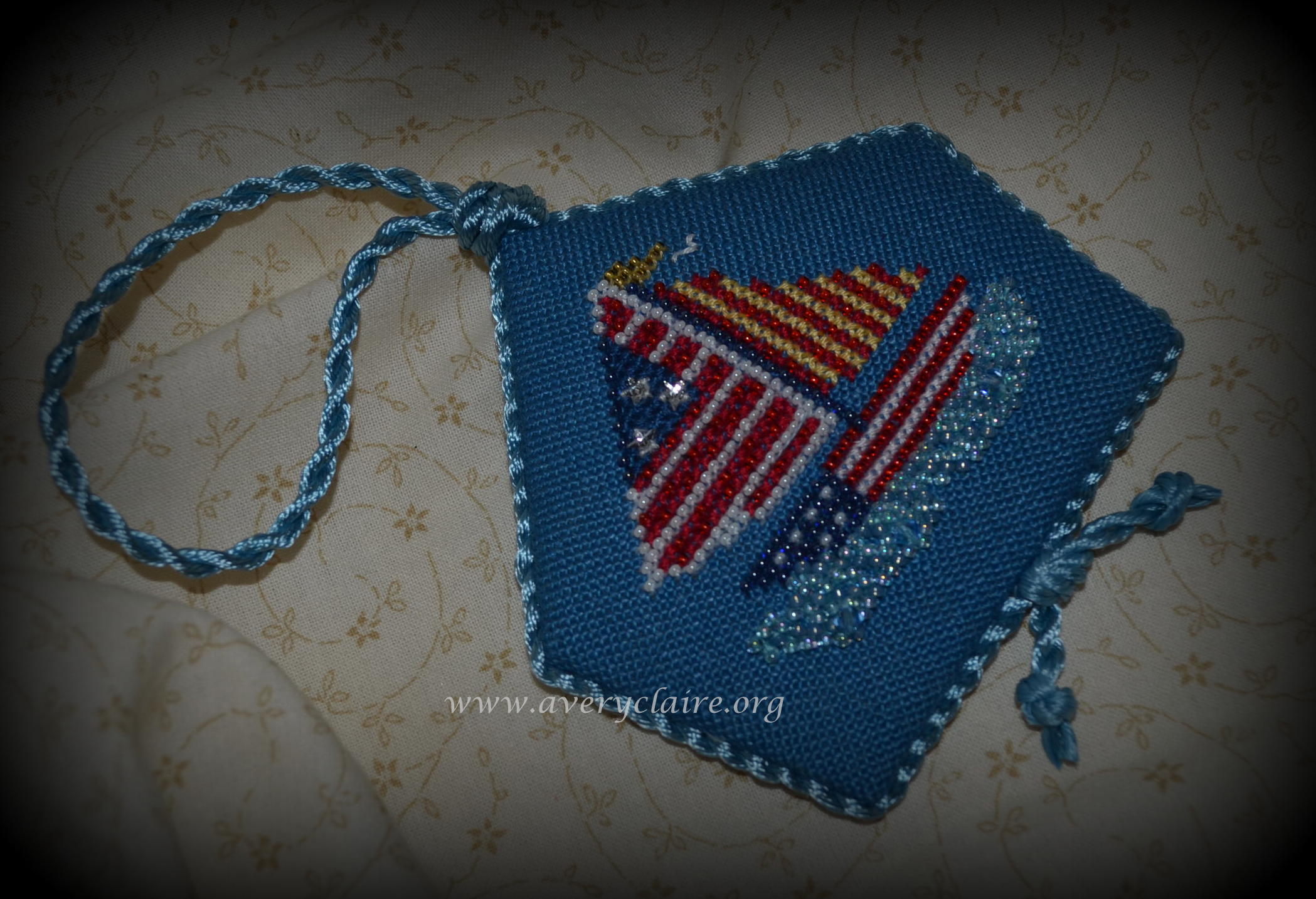 The next she did is this Sailboat Ornament. It’s very elegant with the rayon floss I used for cording and is perfect with the “sea” themed backing I had in my stash.