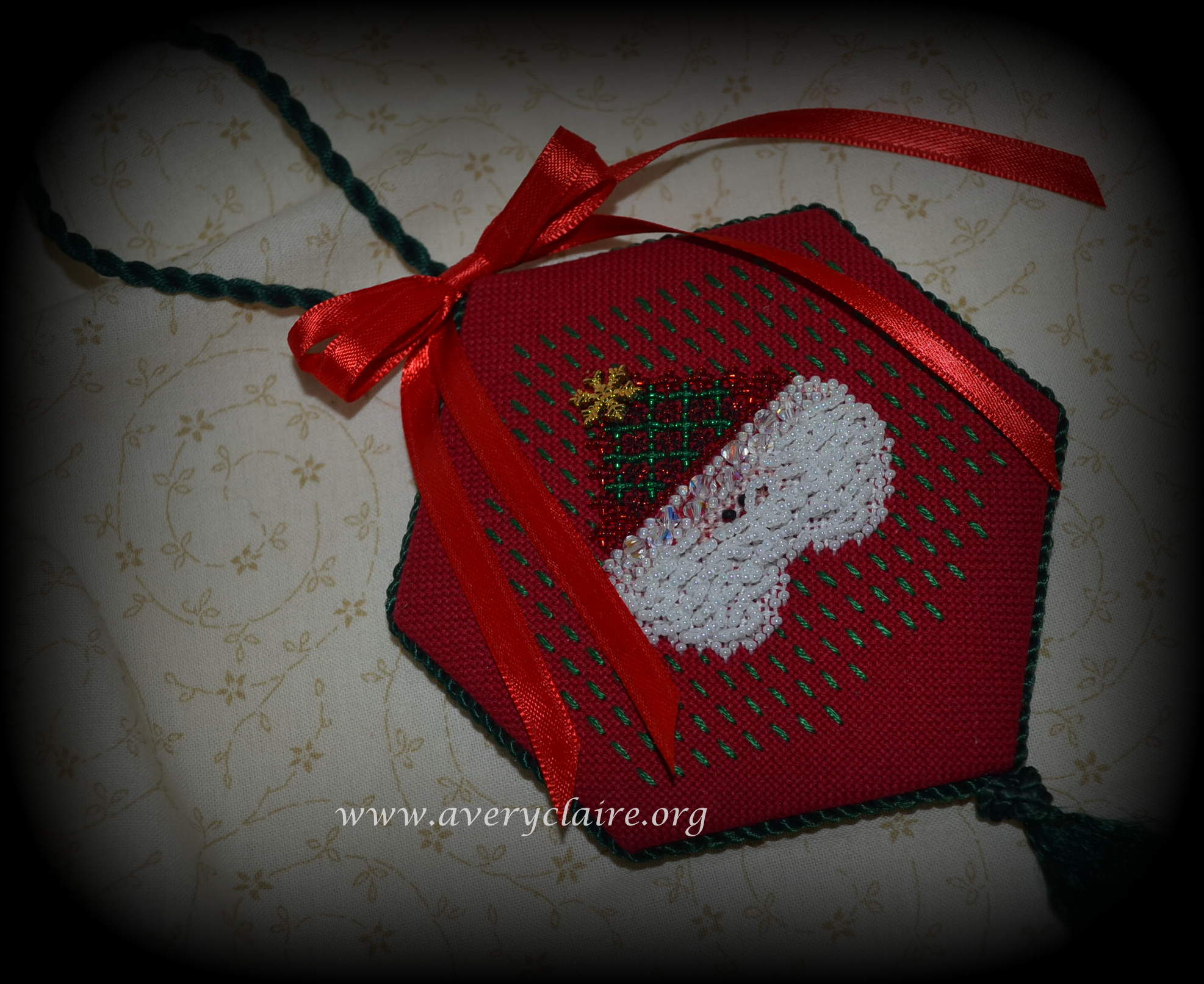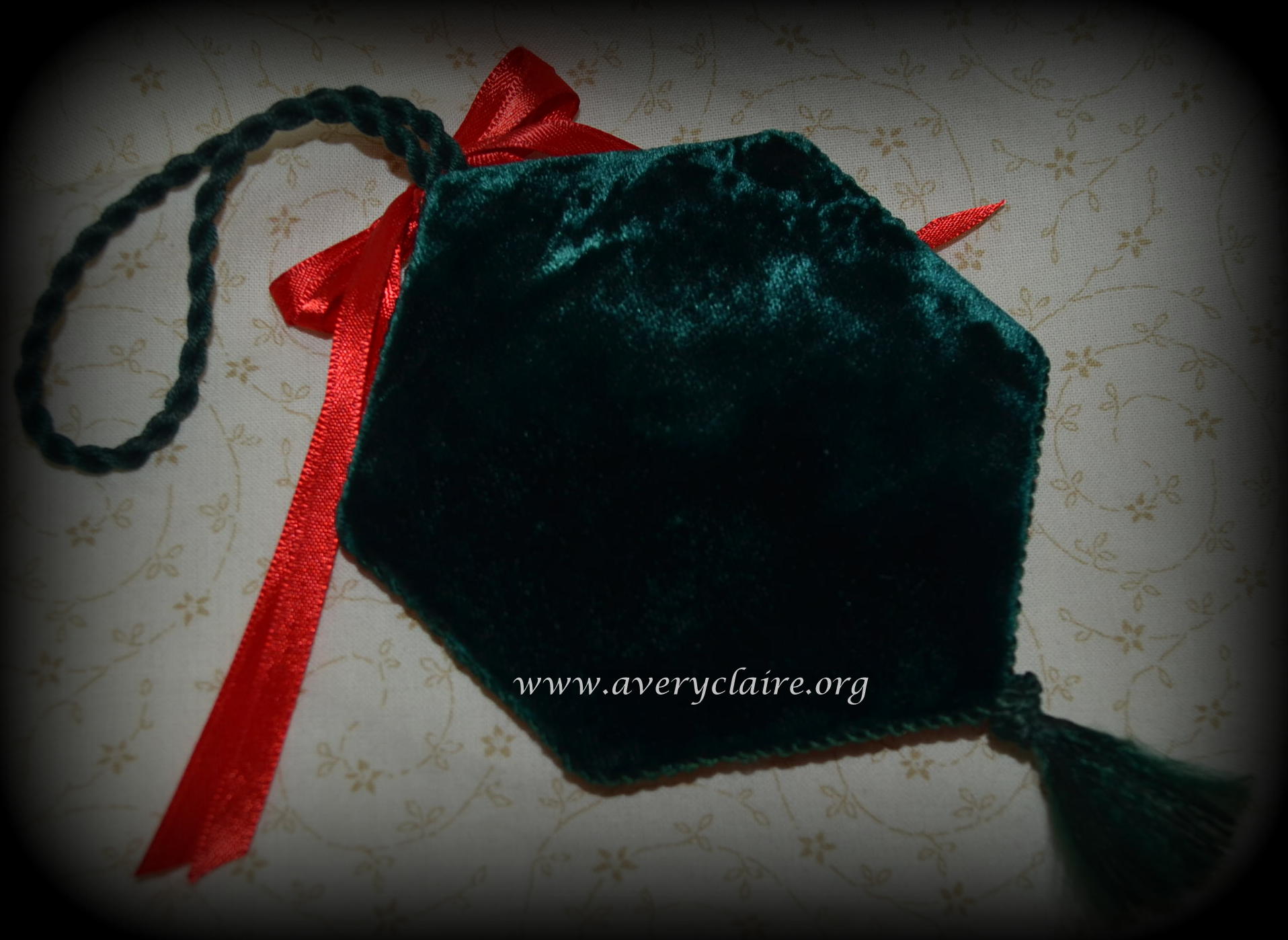 And talk about elegant…well this Santa is quite stunning! His beard is made of all beads! A work of art! And I finished it will a green velvet back.