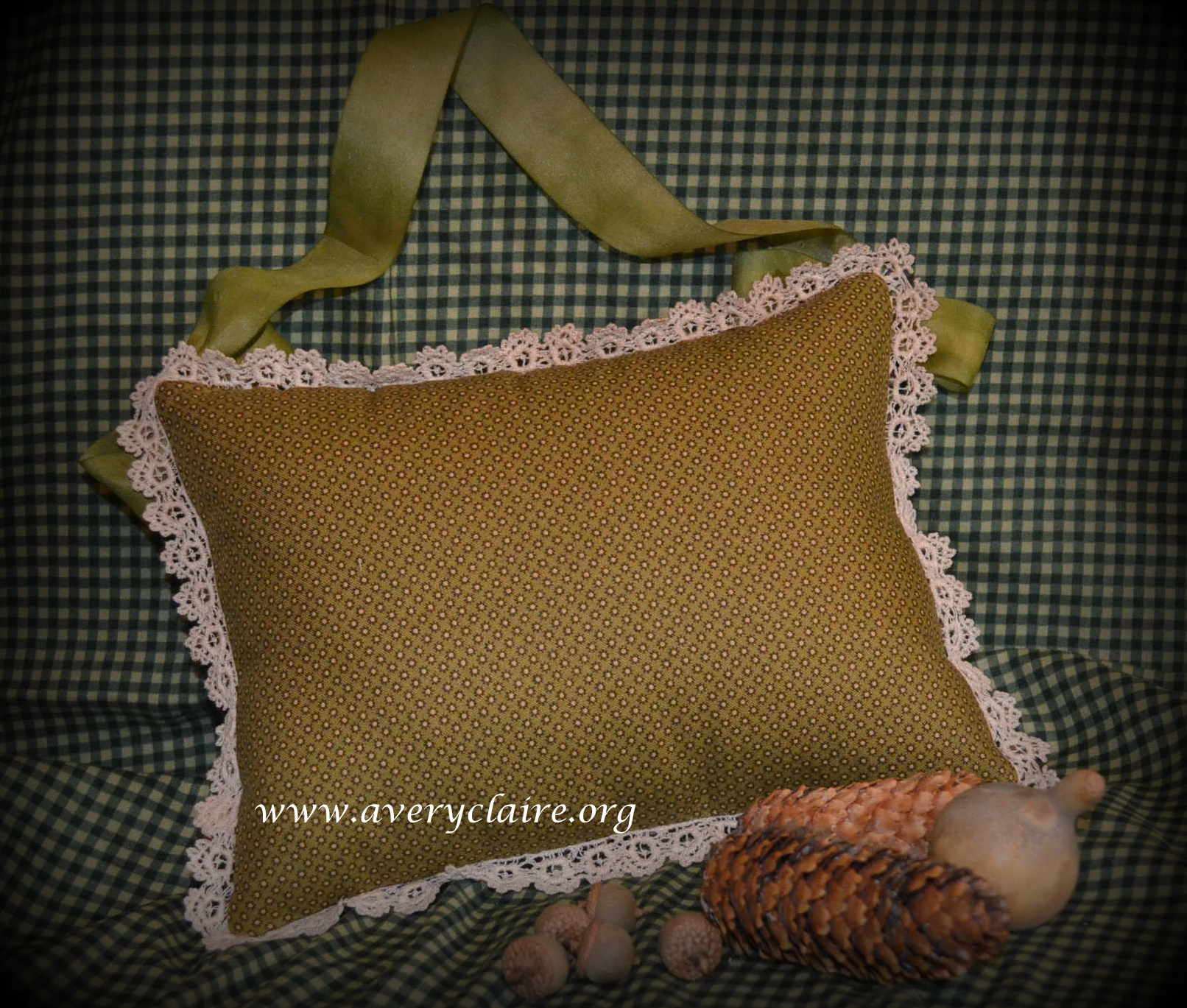 Vivian made this lovely primitive pillow from the pattern “Christmastide” by Notforgotten Farm. She said it reminded her of she and her sister decorating the Christmas tree! I used the antique lace she gave me and I hand-dyed silk ribbon to coordinate with the pillow. It is a very pretty piece.