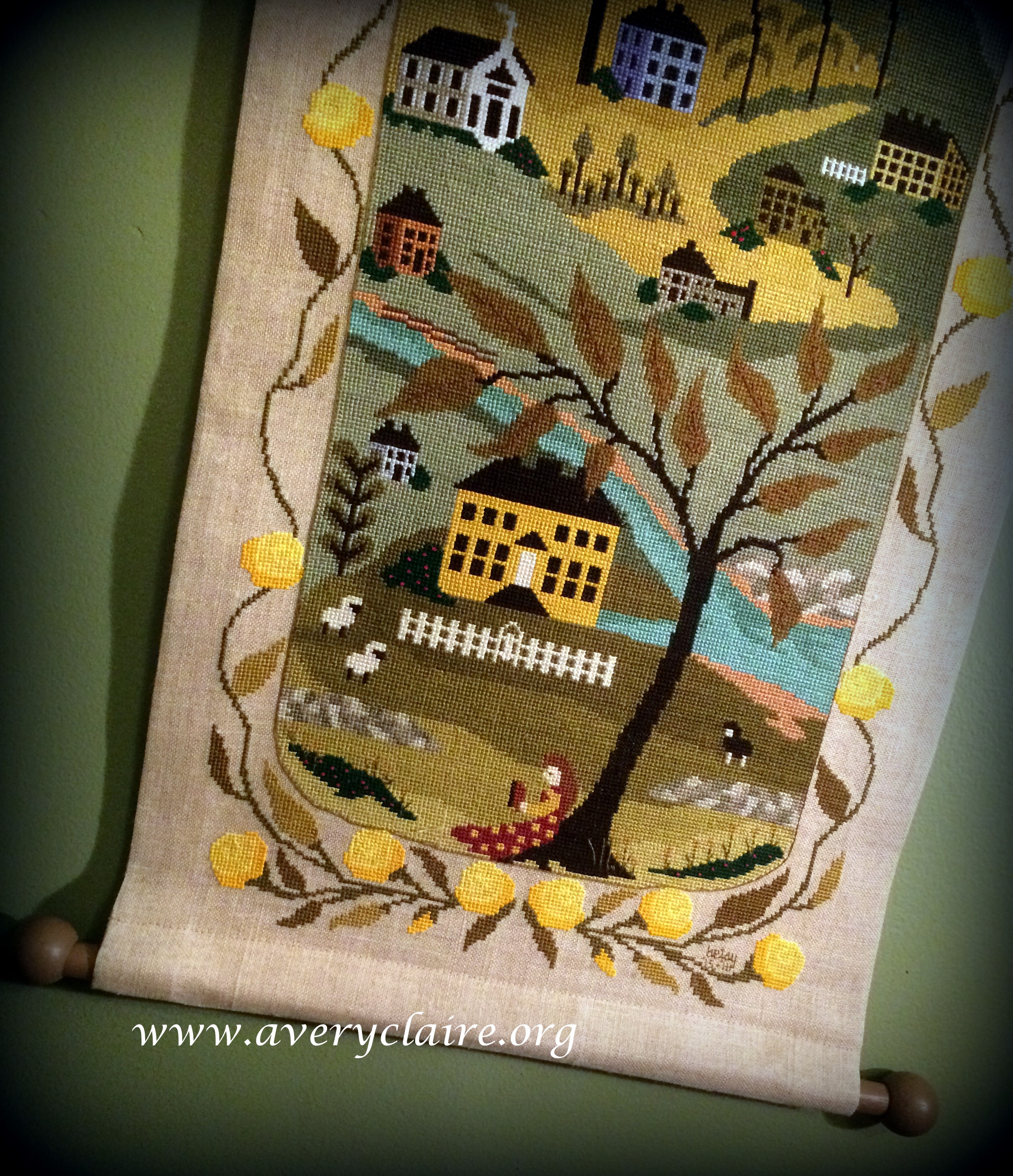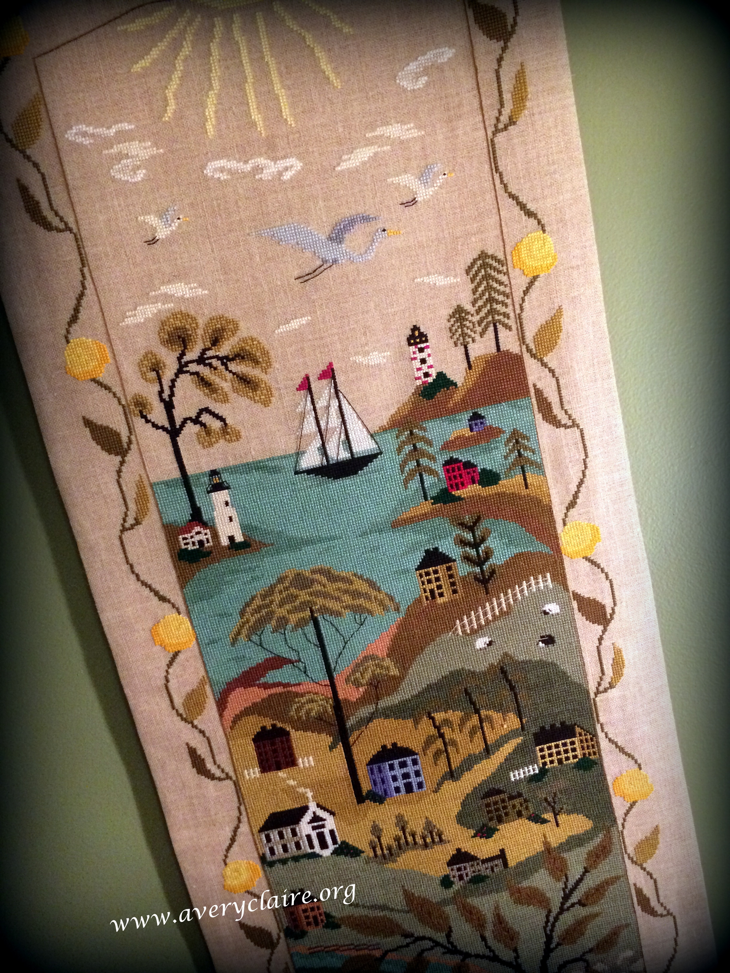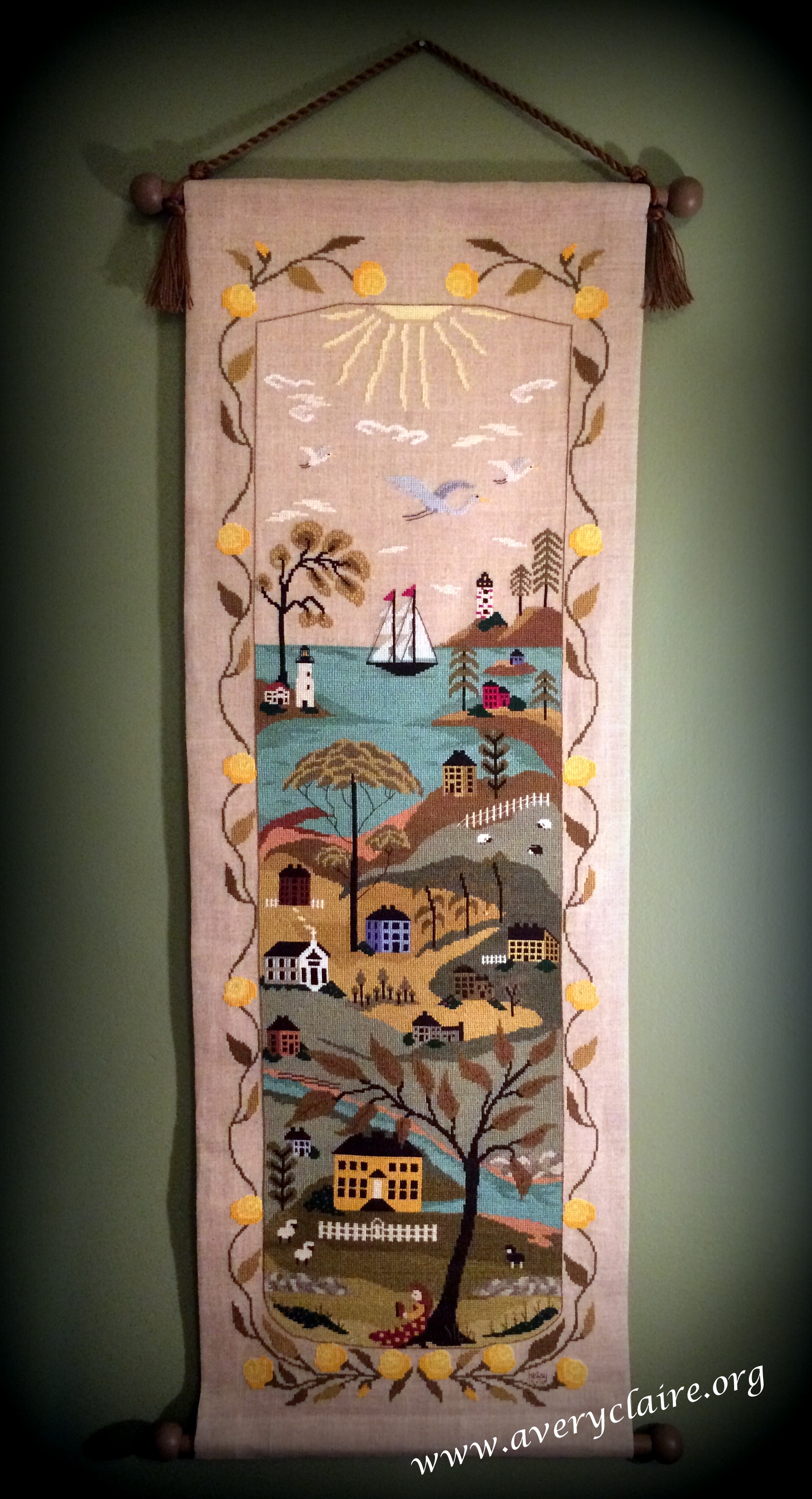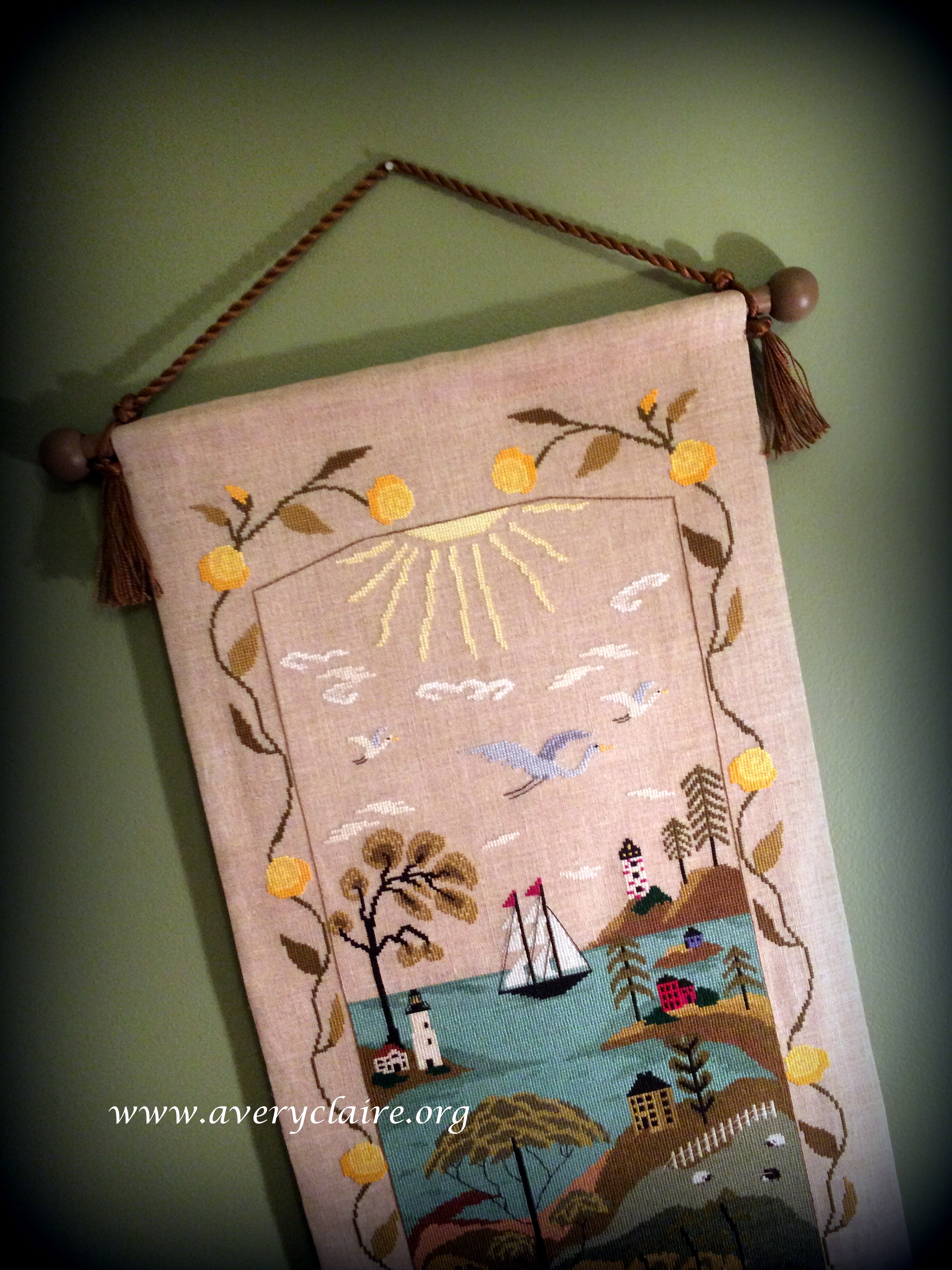 And Betsy…well there are no words to describe this luscious sampler. It is from By the Bay Needle Art and is called Serenity Harbor Sampler. She changed the flowers from pink to yellow and the large house at the bottom to yellow as well. It took her a year to complete and is stunning! I added a coordinating plain fabric backing and used handmade cording. I painted the dowels to match the cording and the look is complete!