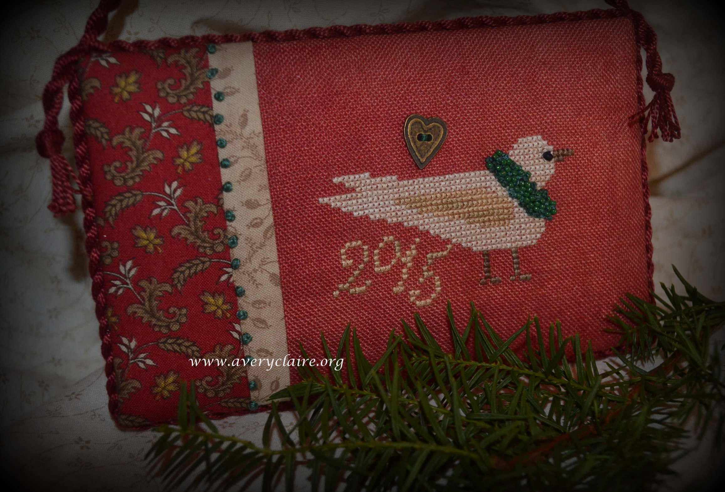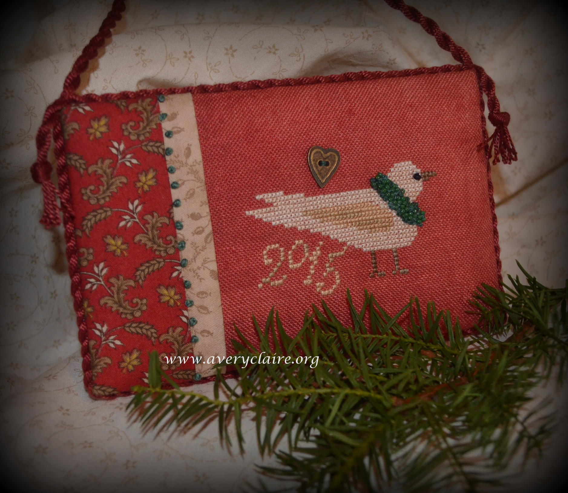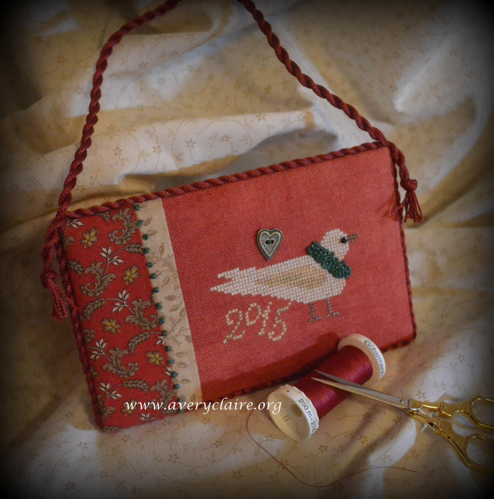 The TinSmiths Wife stitched this peaceful Dove on a gorgeous unusual red fabric, adding the lovely turquoise beads and knots around the neck and requested a cupboard hanger. I added some more knots to the trim:
