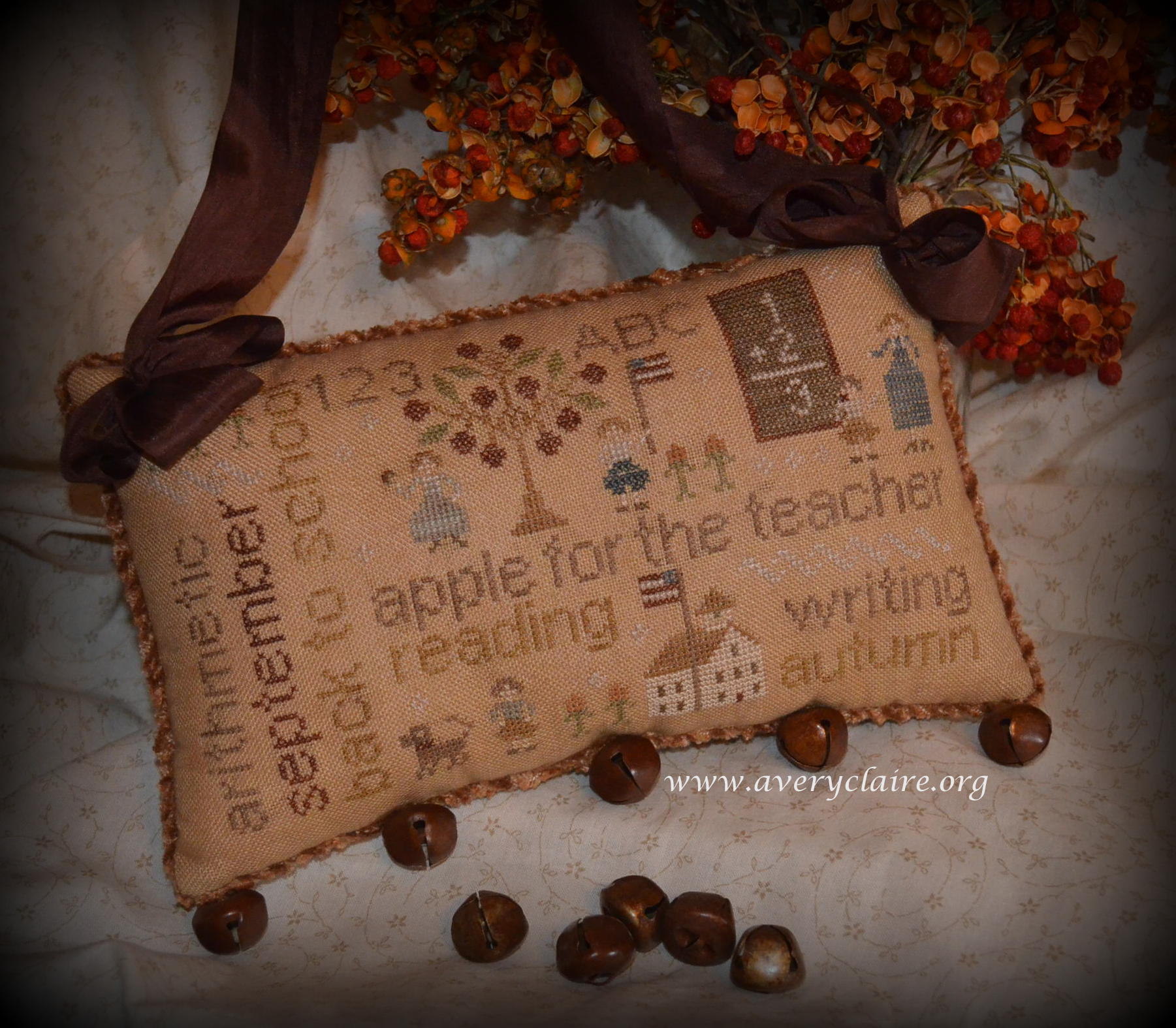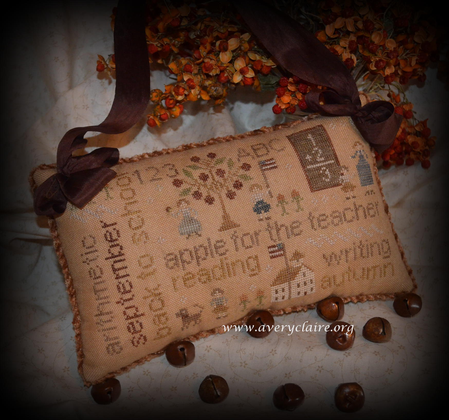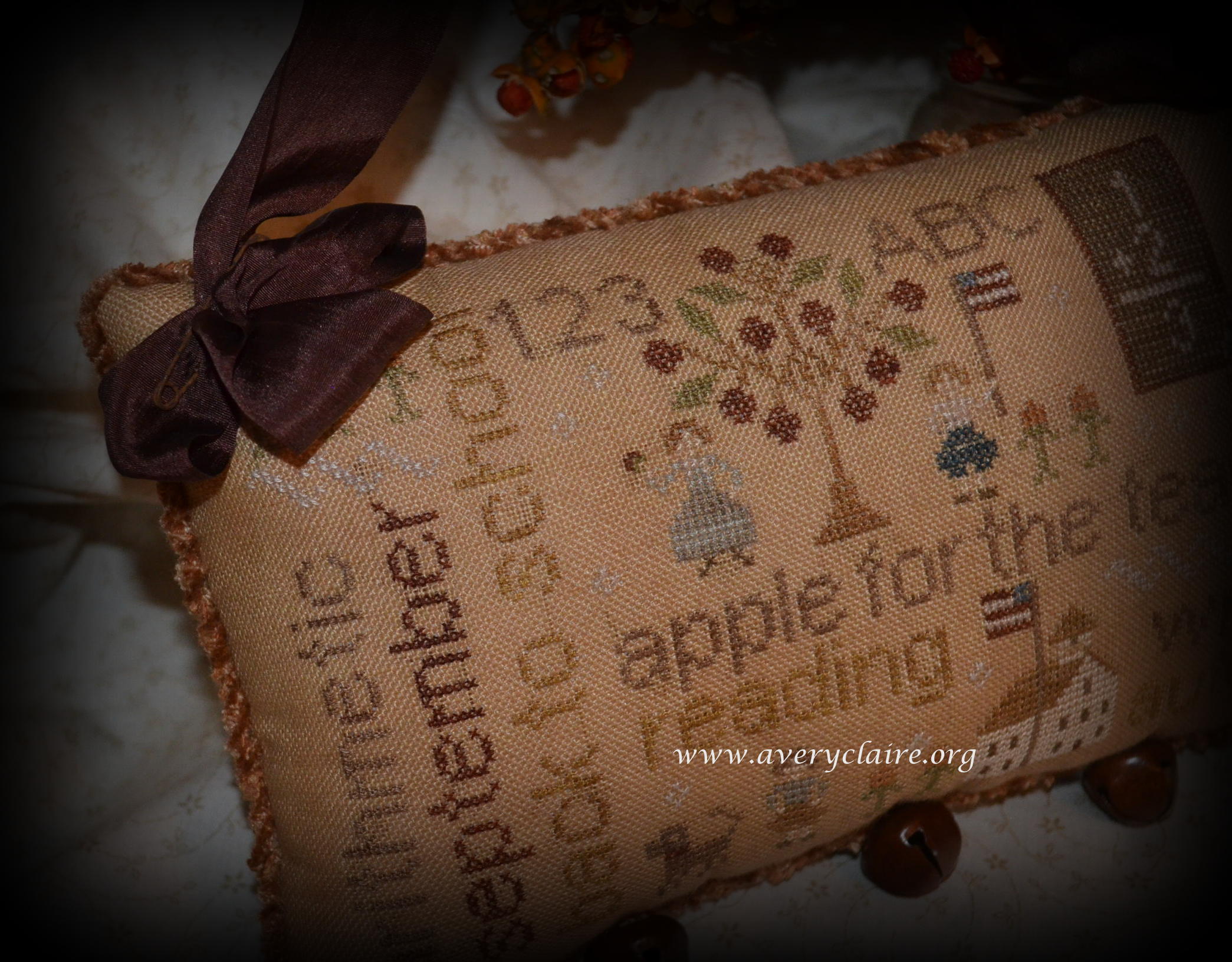 V.DiN. beautifully rendered this special pillow, hung with wide silk ribbon and surrounded by twisted chenille trim, as a lovely gift:
