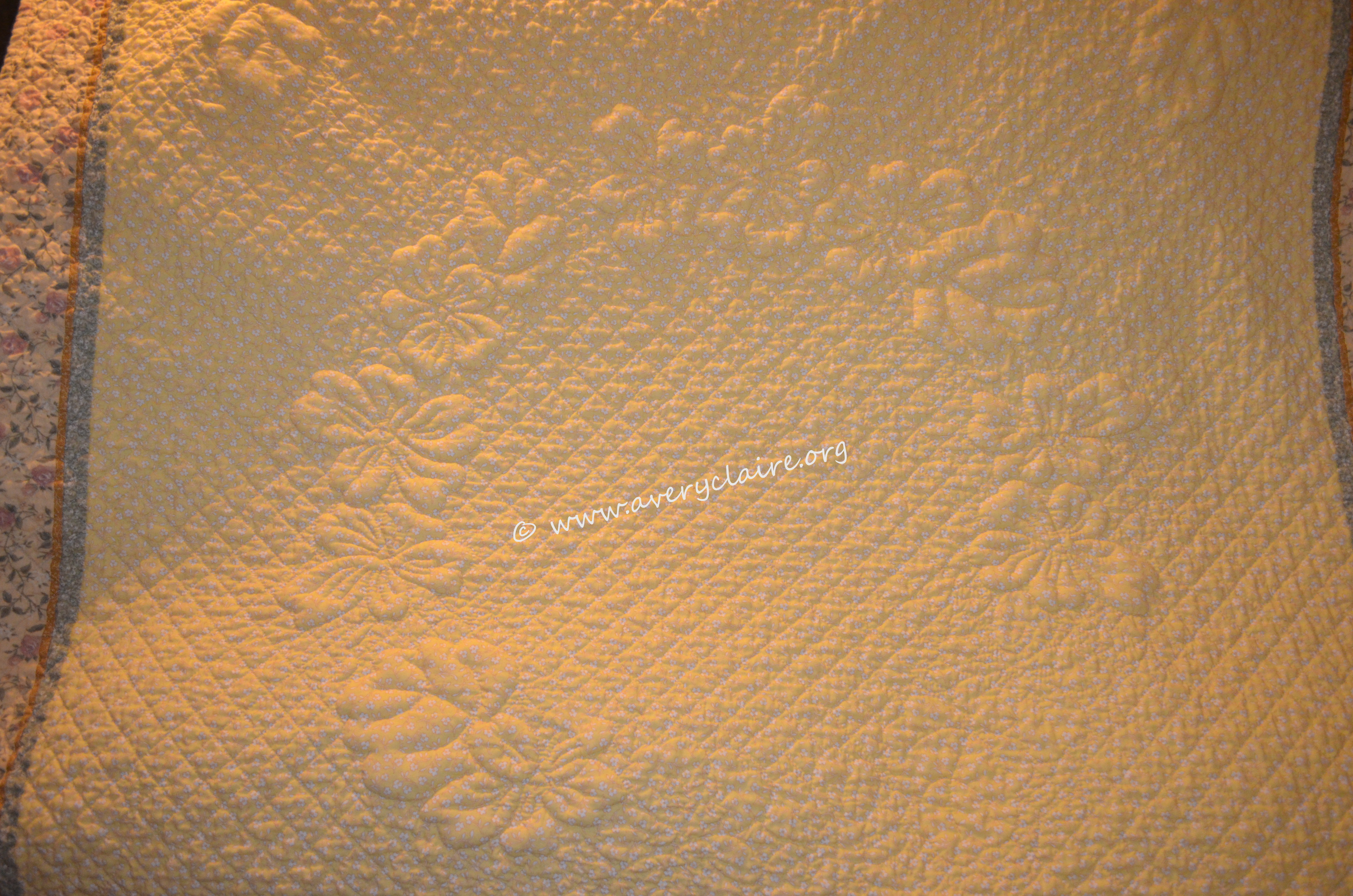 This French needlework technique is easy to do if you like handwork. Stitching the piece is rather like hand quilting, a small running stitch, on two pieces of batiste. Then the boutis yarn is drawn through the channels by inserting a tapestry needle from the back between the two layers of fabric. Voila!
