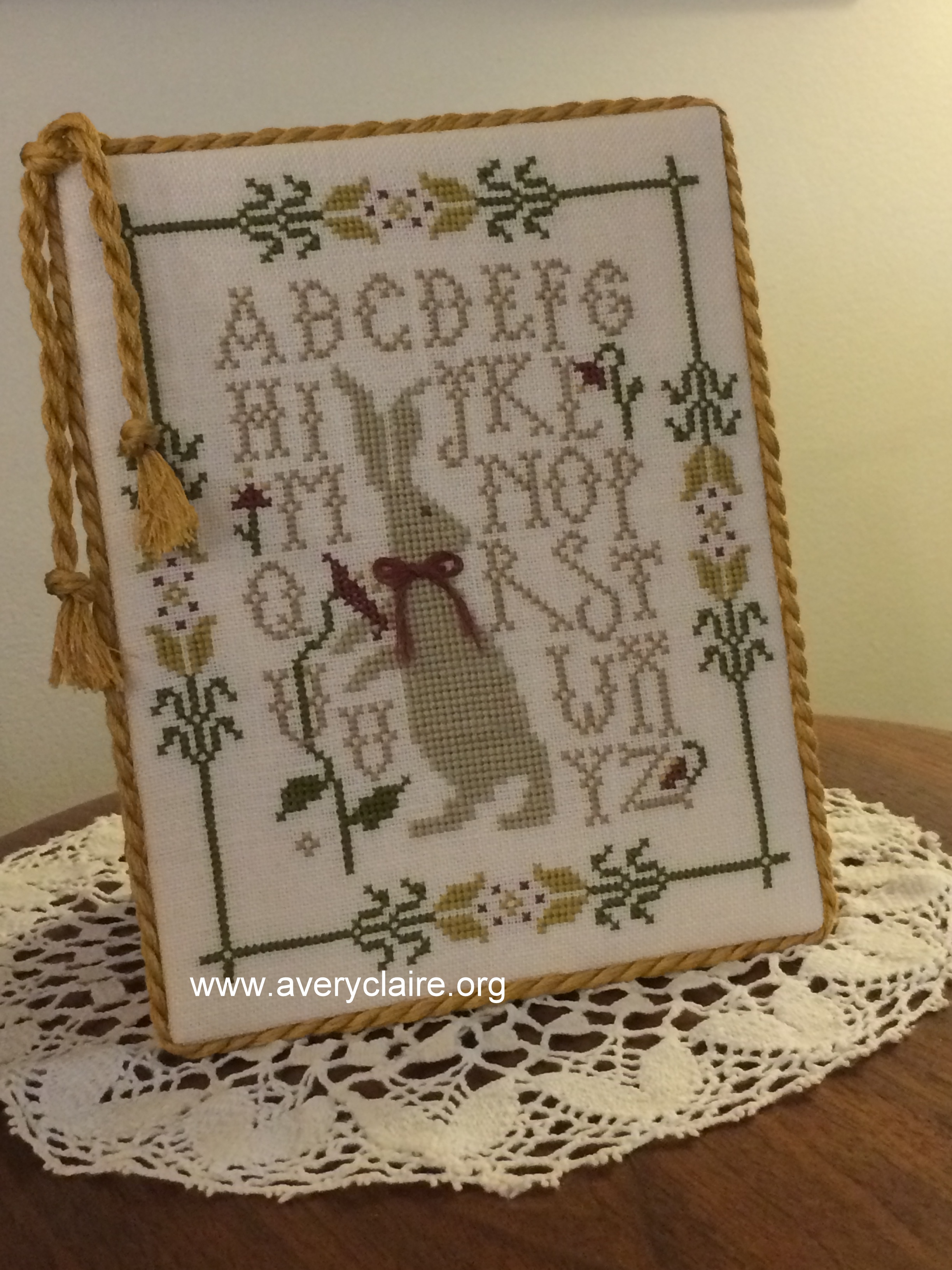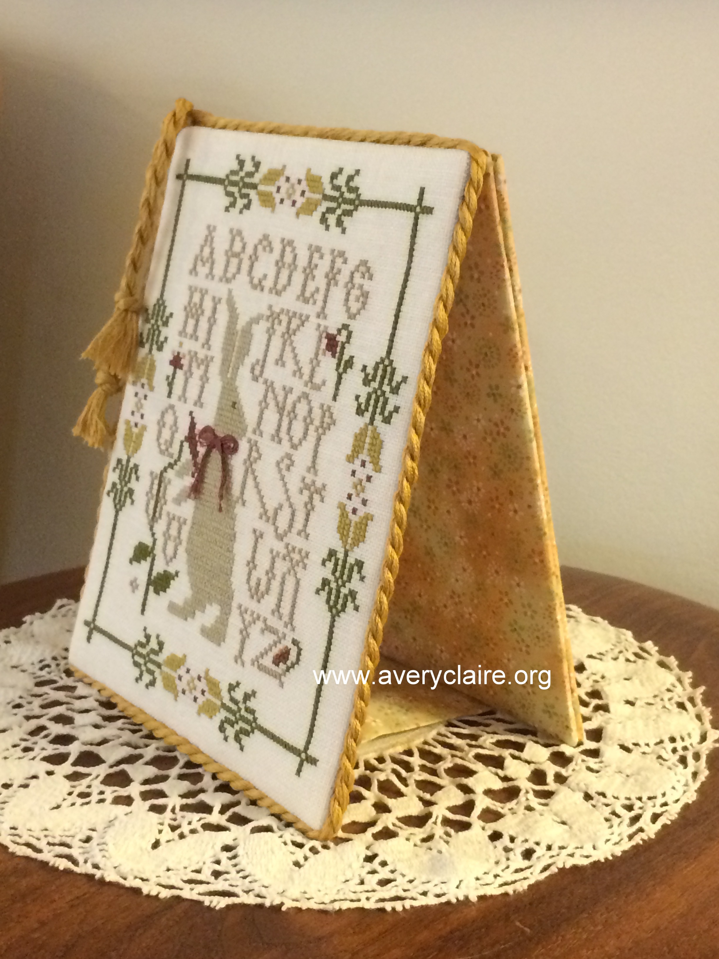 And Betsy…well there are no words to describe this luscious sampler. It is from By the Bay Needle Art and is called Serenity Harbor Sampler. She changed the flowers from pink to yellow and the large house at the bottom to yellow as well. It took her a year to complete and is stunning! I added a coordinating plain fabric backing and used handmade cording. I painted the dowels to match the cording and the look is complete!