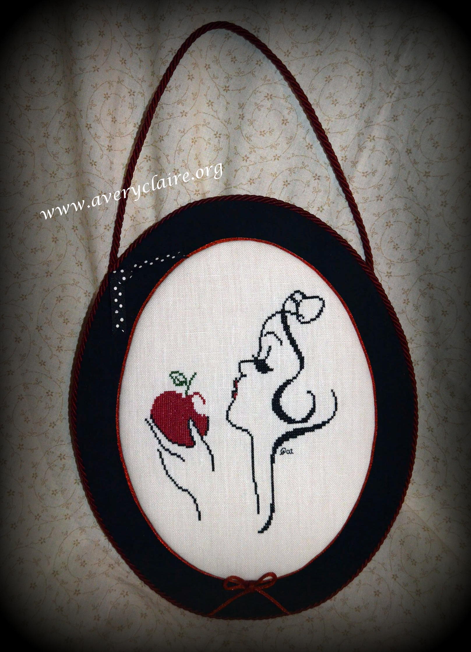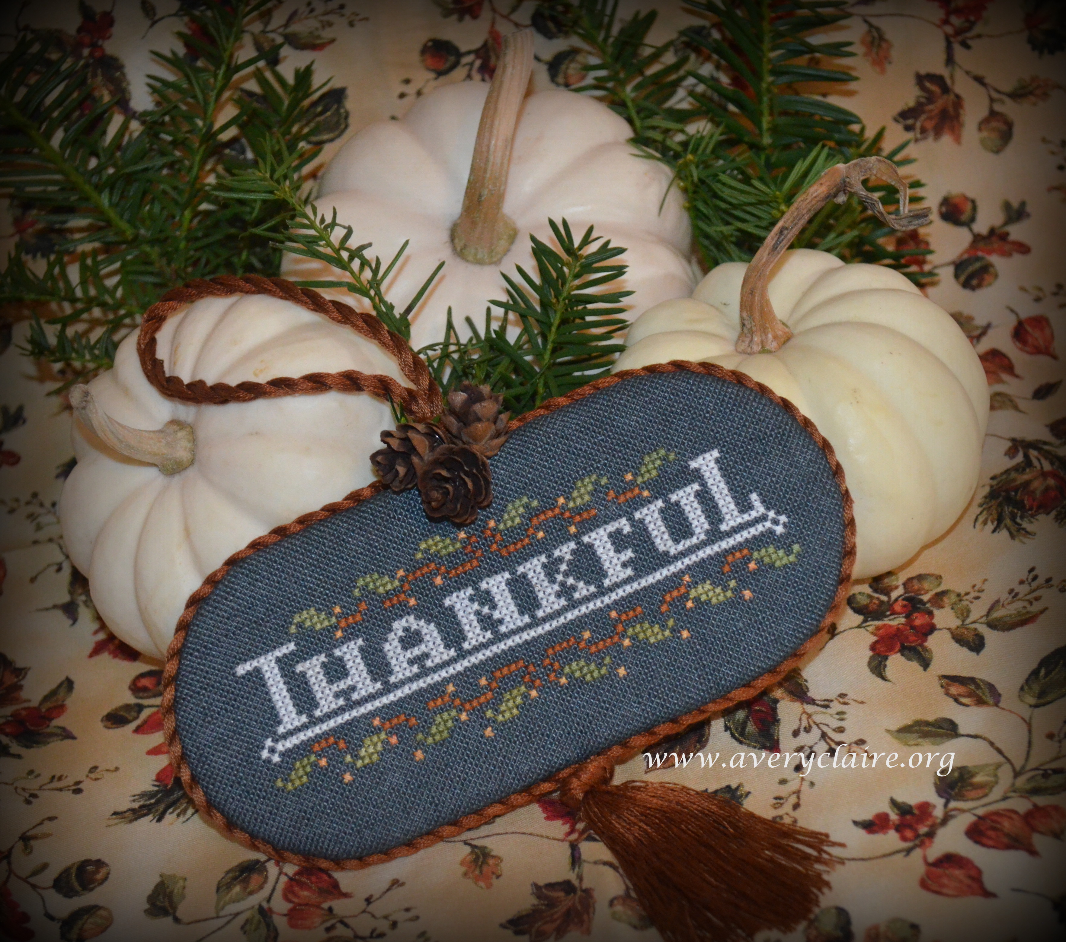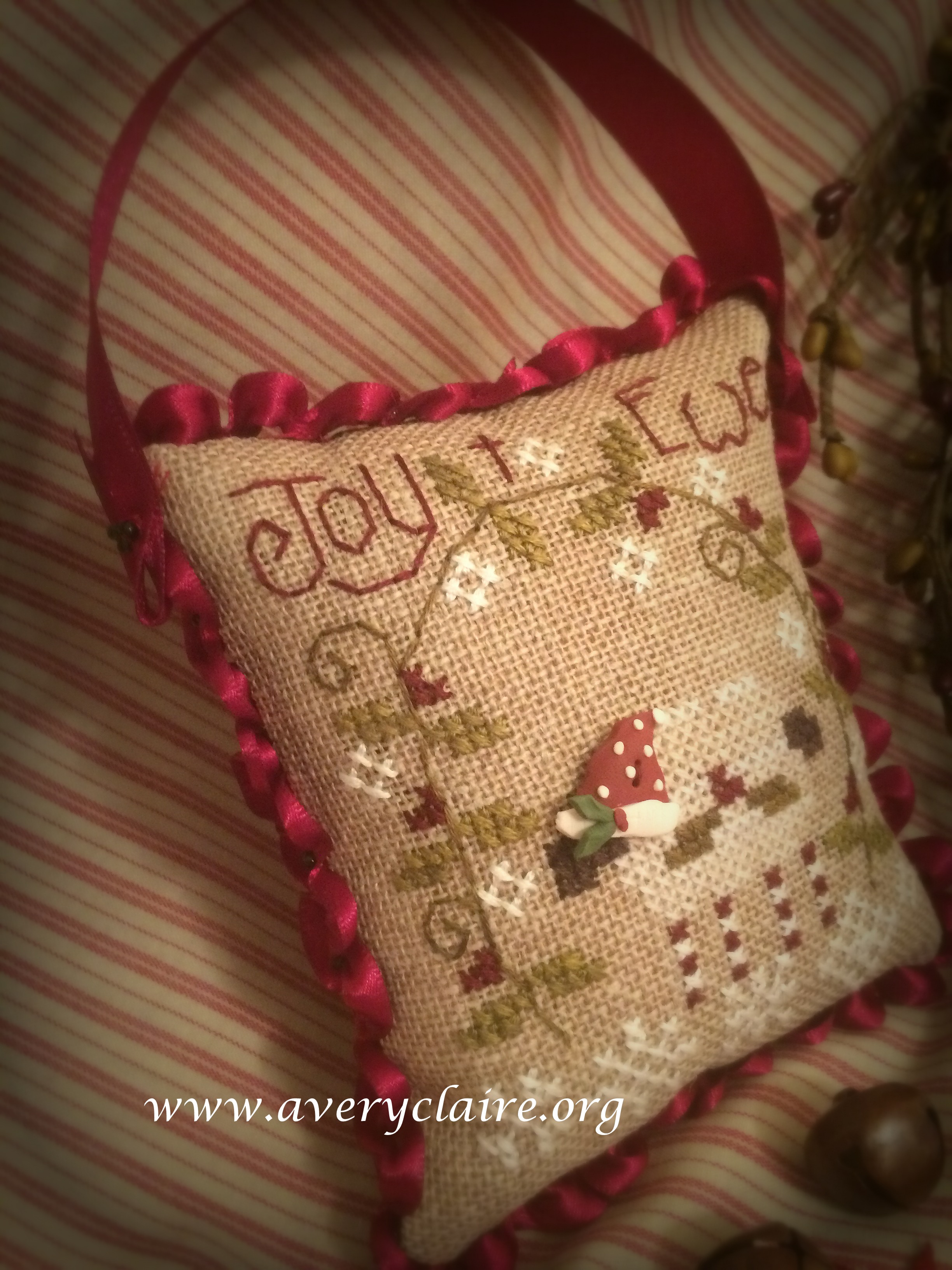 Pat did the first one here. It is from the Plum Street Sampler Leaflet entitled “Good and Plenty.” She found the perfect burgundy mini pom pom trim to go with it! I love pieces like this that go all the way through Autumn!