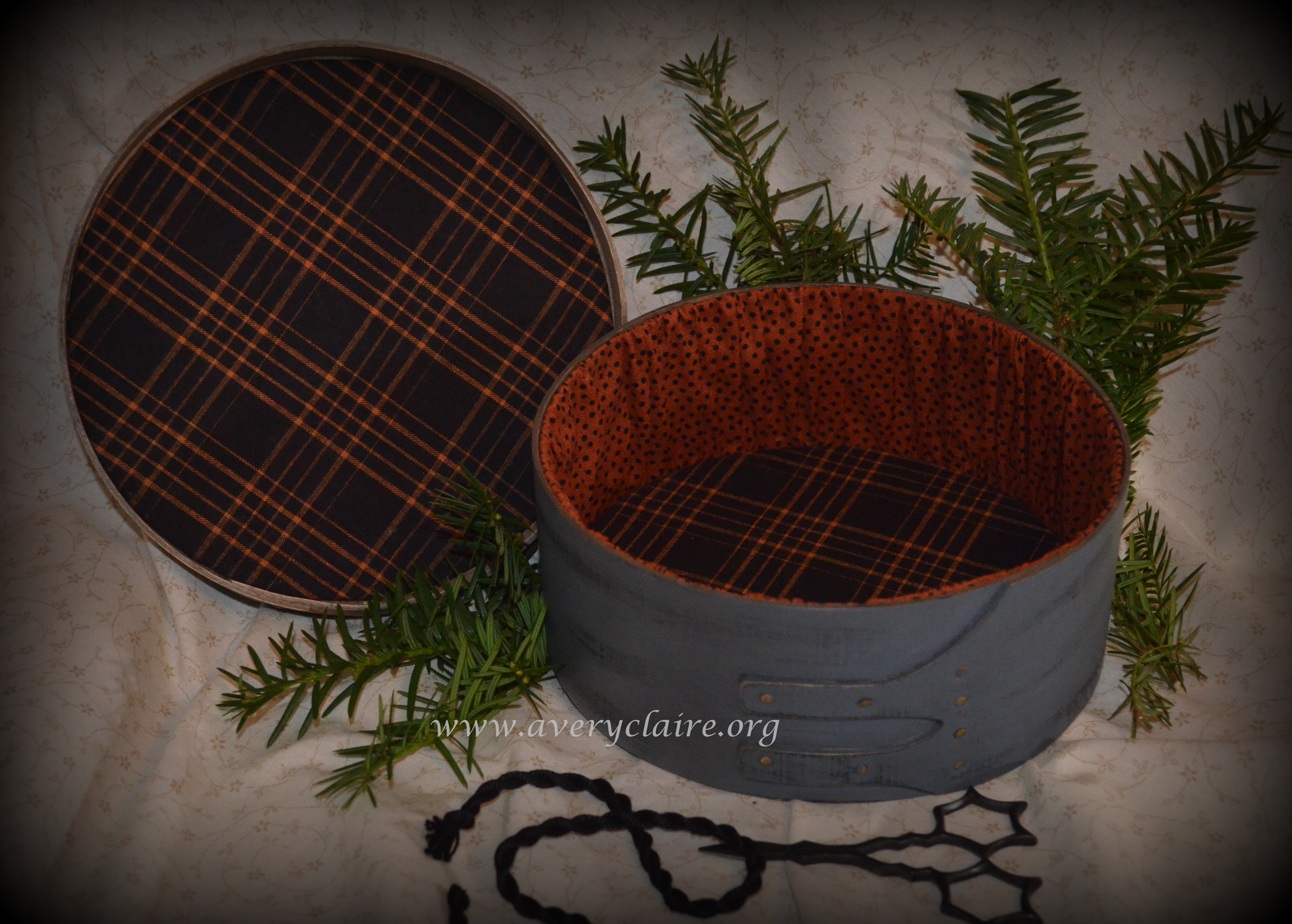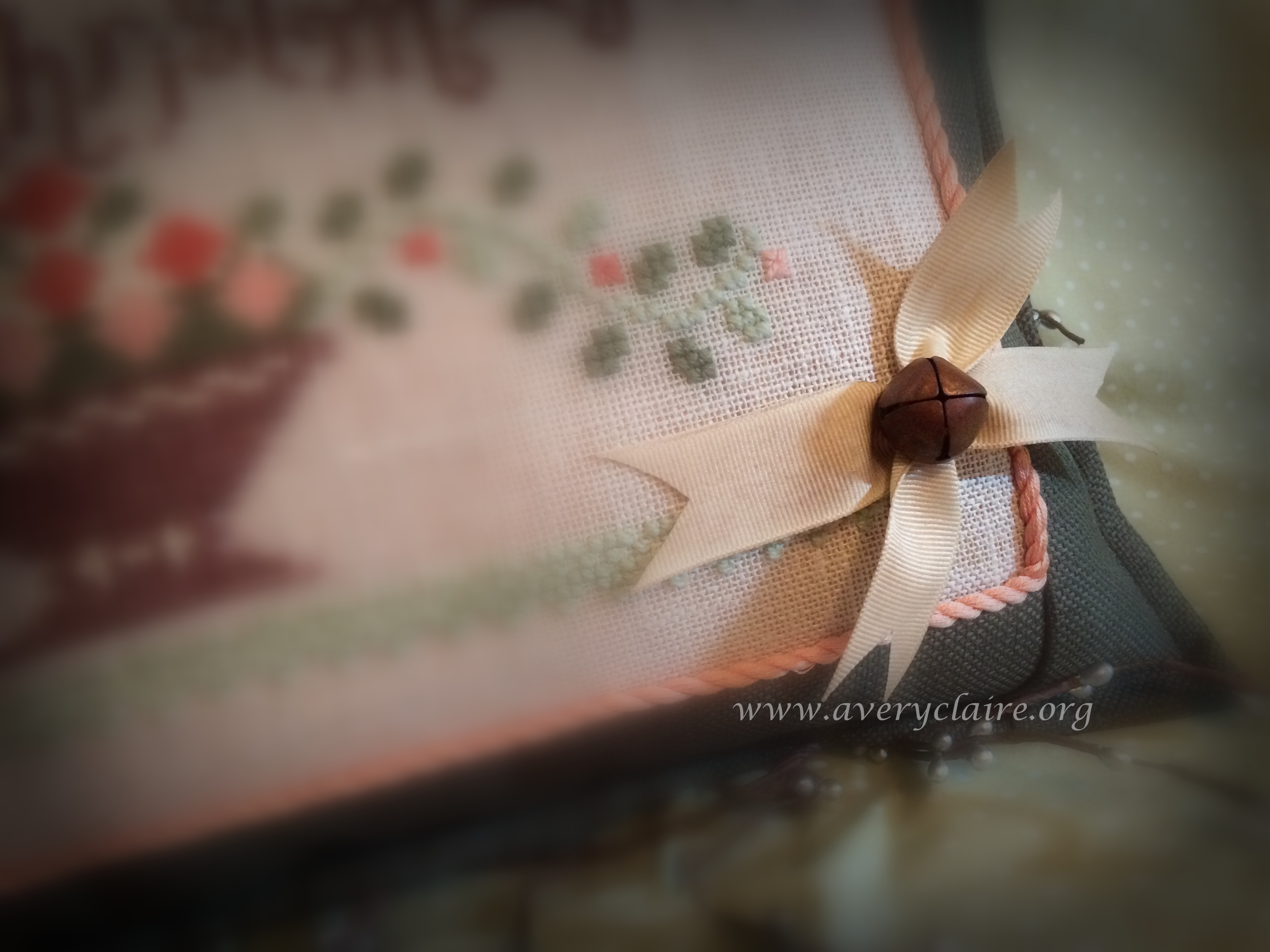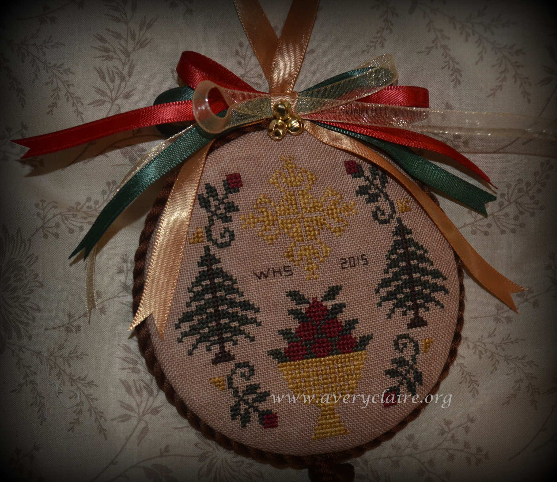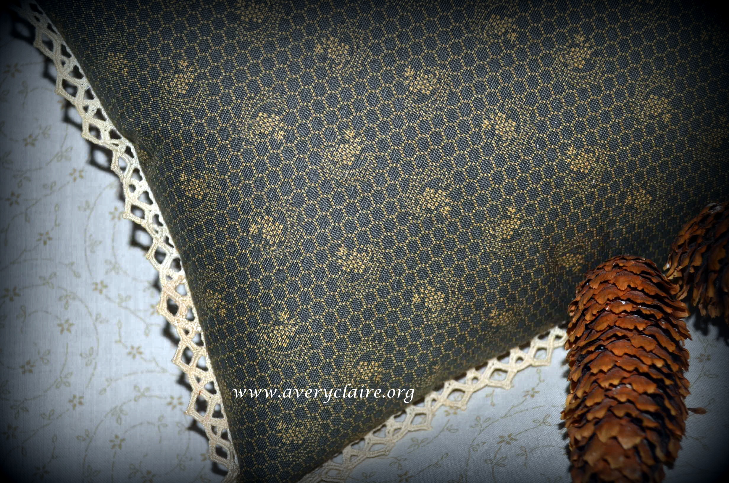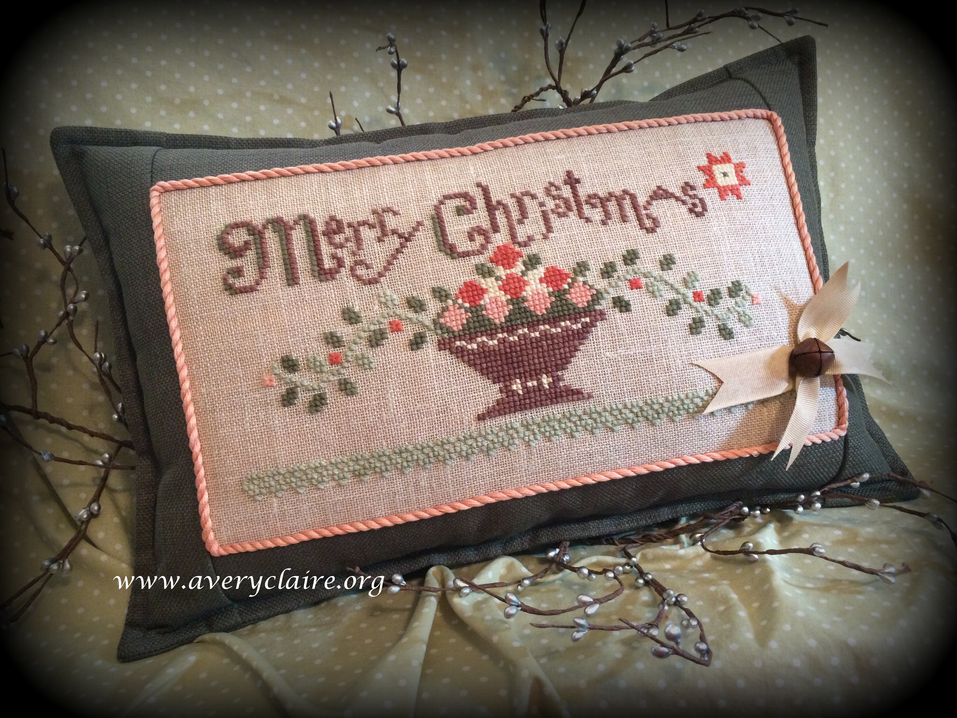 Vivian made this lovely primitive pillow from the pattern “Christmastide” by Notforgotten Farm. She said it reminded her of she and her sister decorating the Christmas tree! I used the antique lace she gave me and I hand-dyed silk ribbon to coordinate with the pillow. It is a very pretty piece.