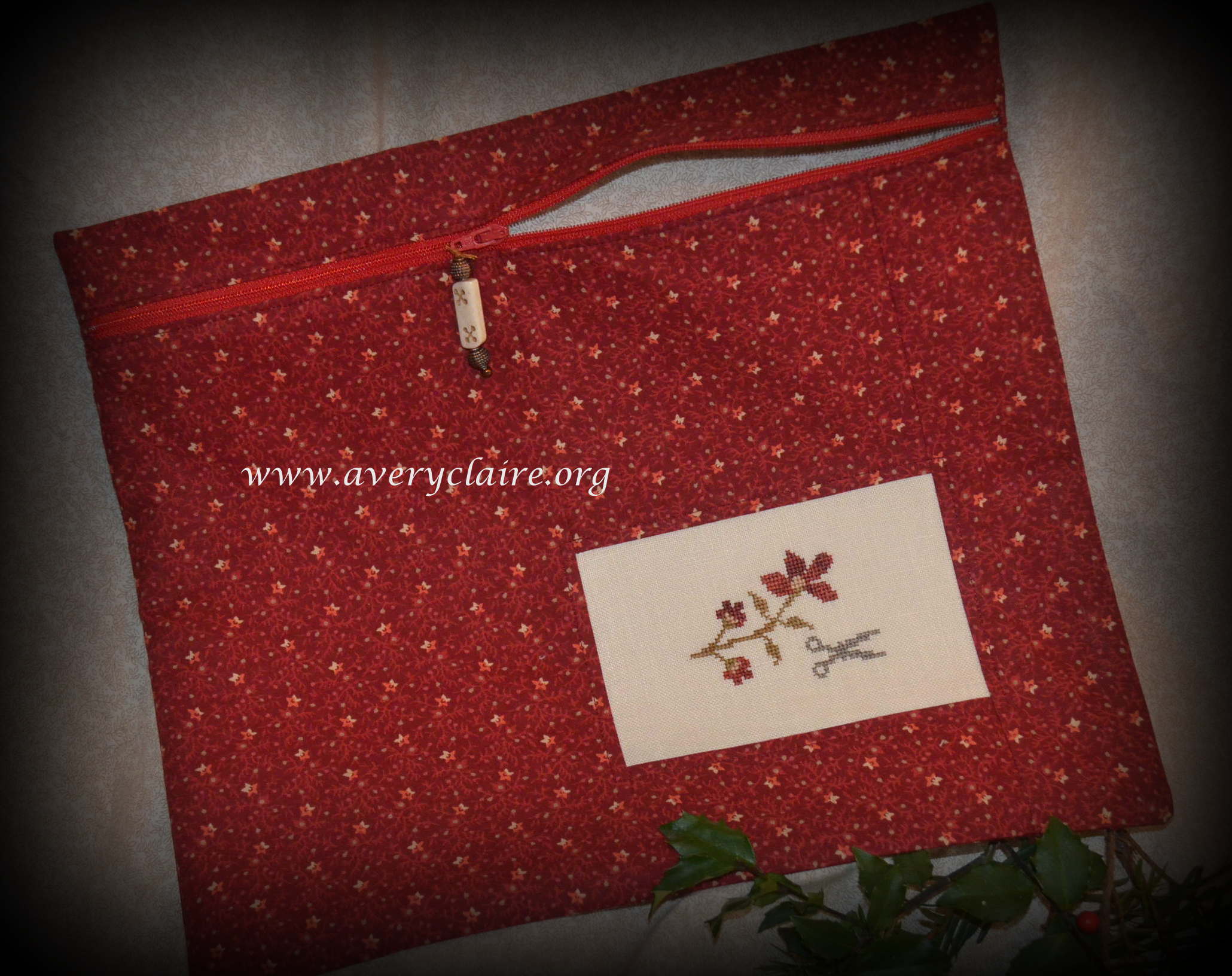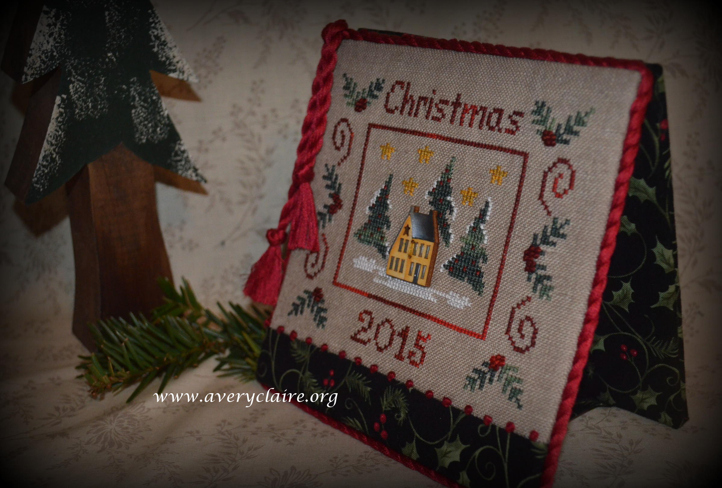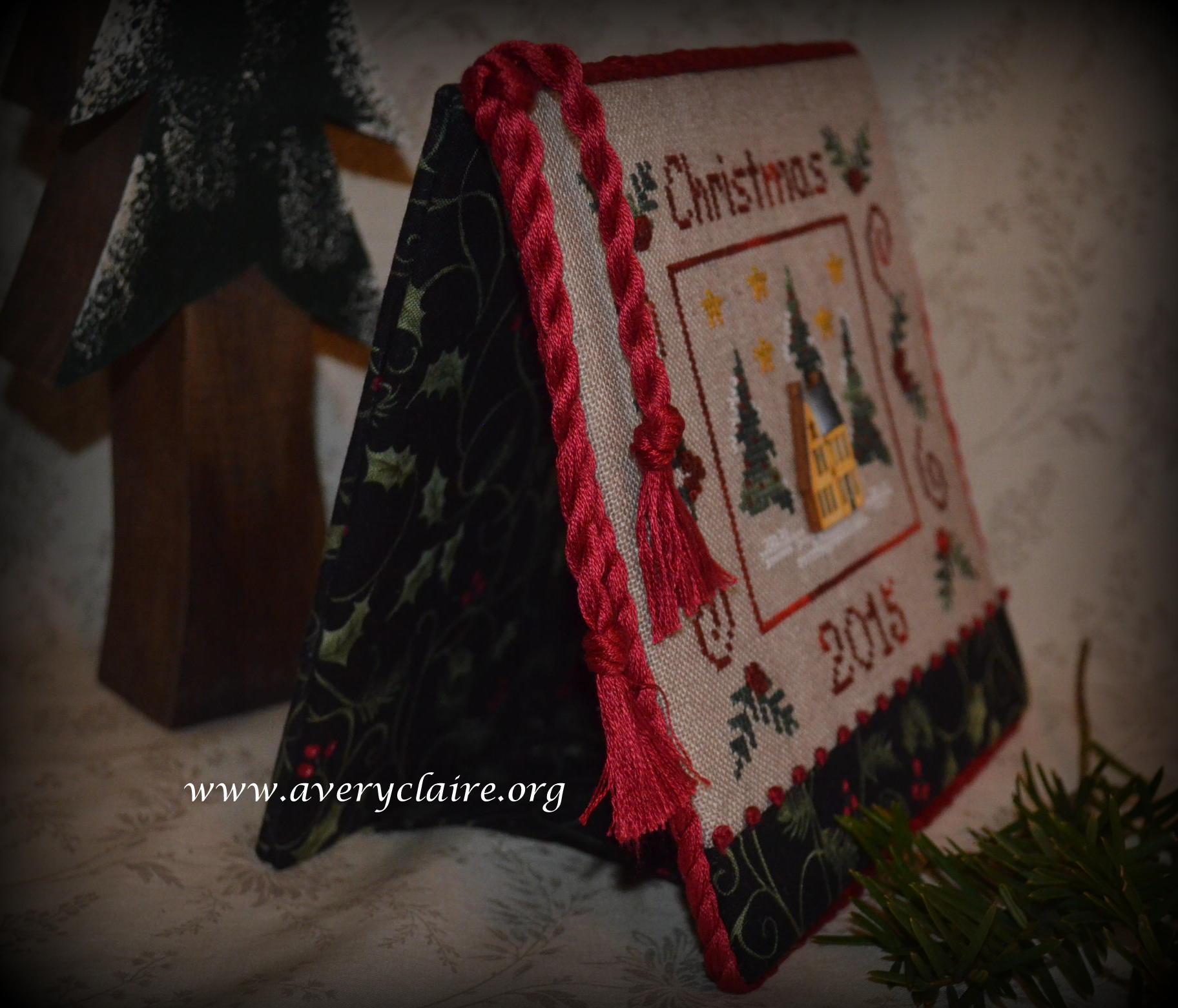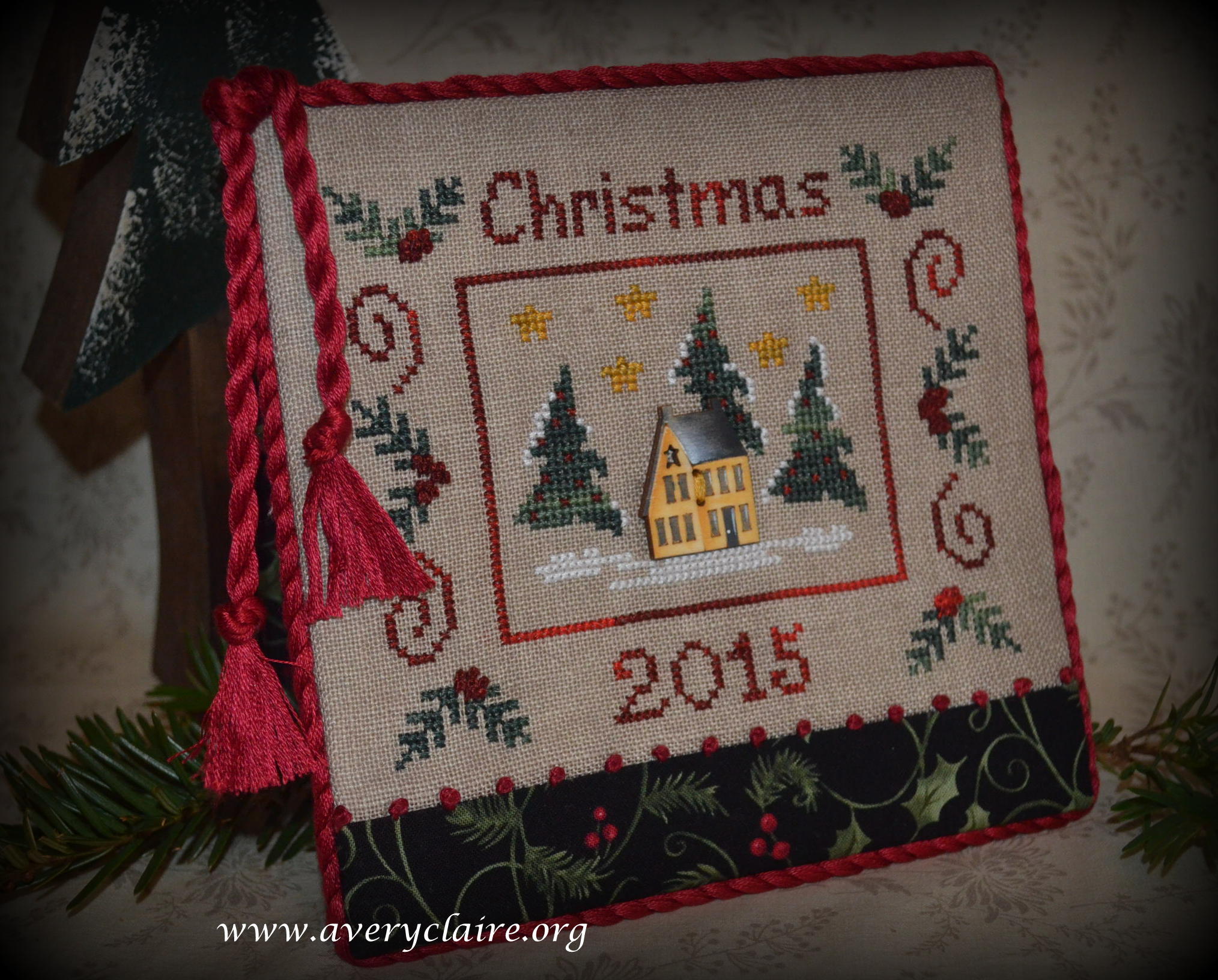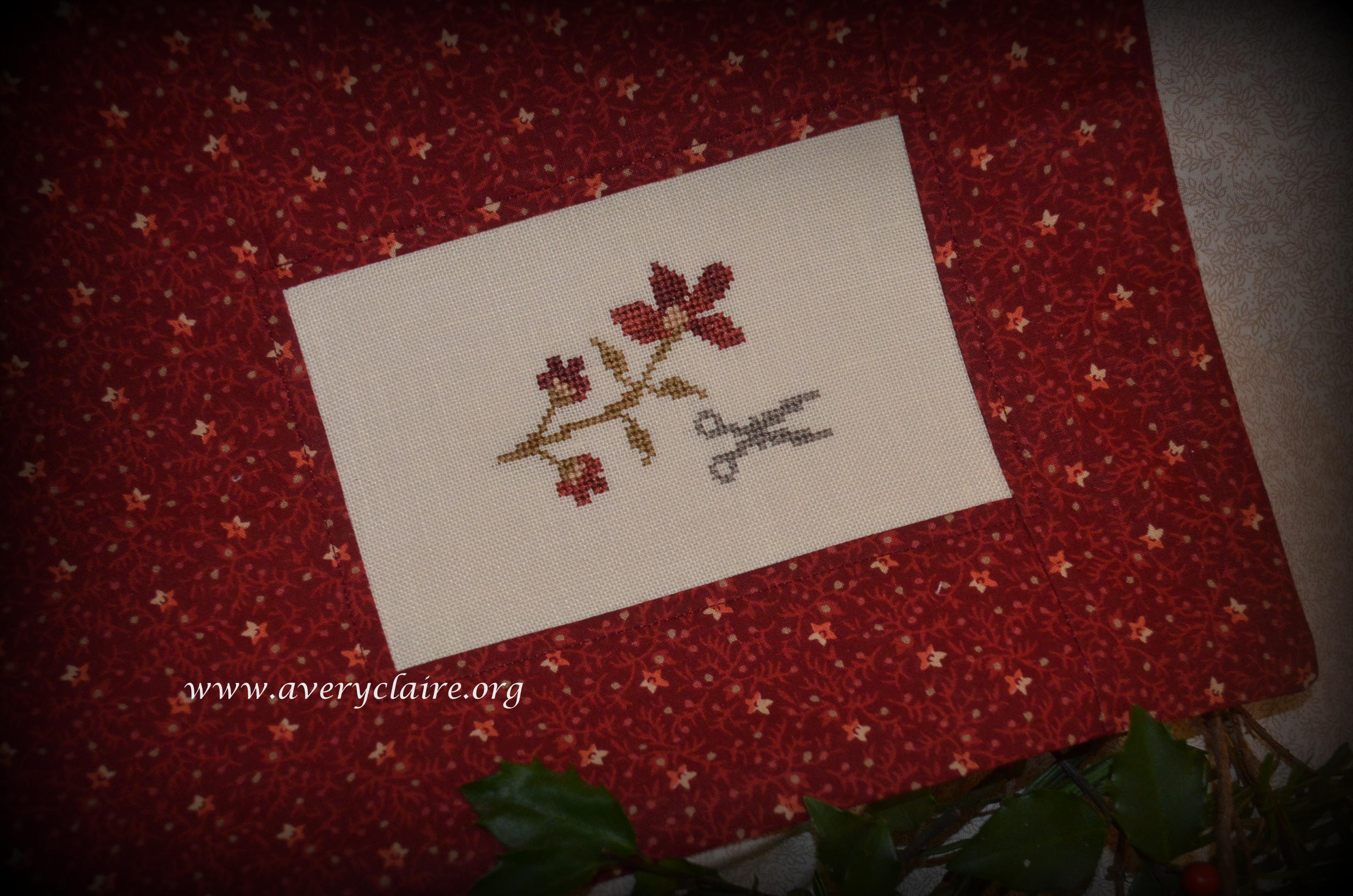 Vivian is an extraordinary quilter, but loves to do cross-stitch too. This one is called “Deck the Halls” by Stacy Nash and was made into a pinkeep filled with walnut shells by Vivian. She asked me to attach the mini pom pom trim to it after it was finished, but I like it better within the seam allowance. So I took it apart and finished it with the trim in the seam. She loved it that way.