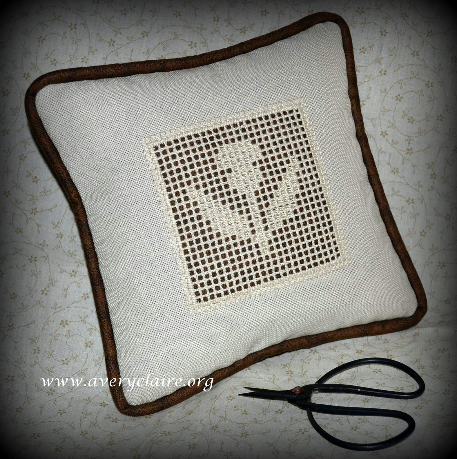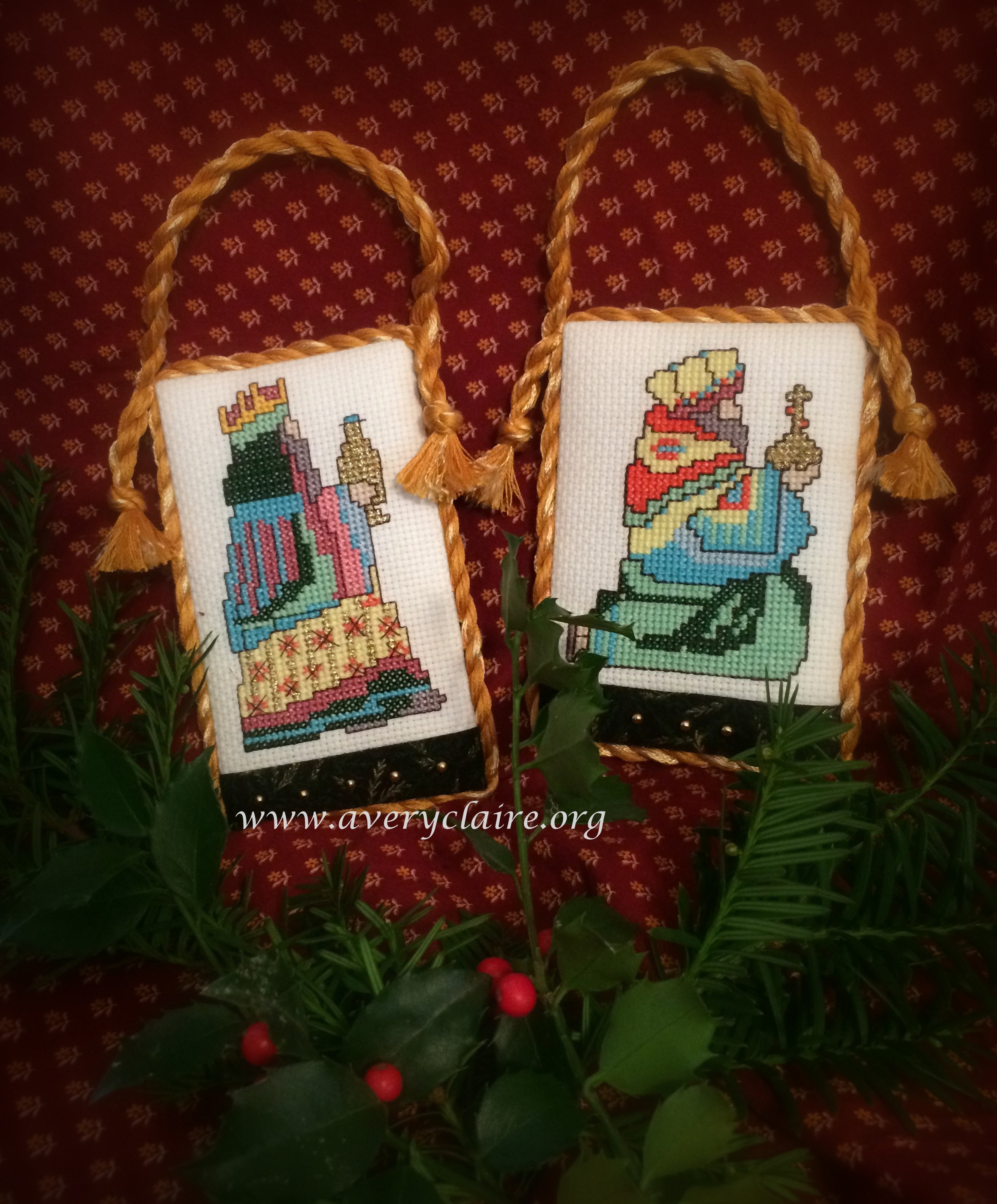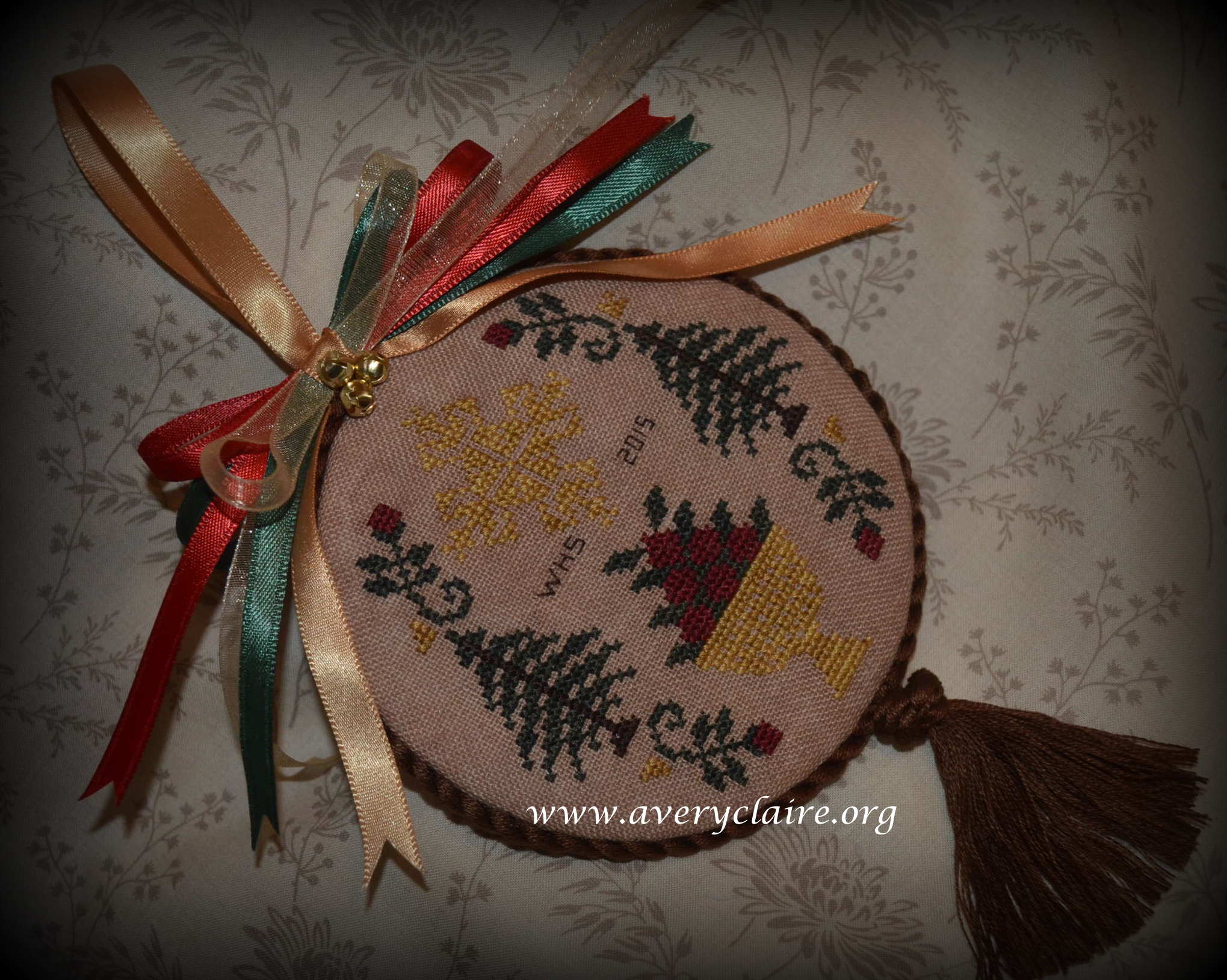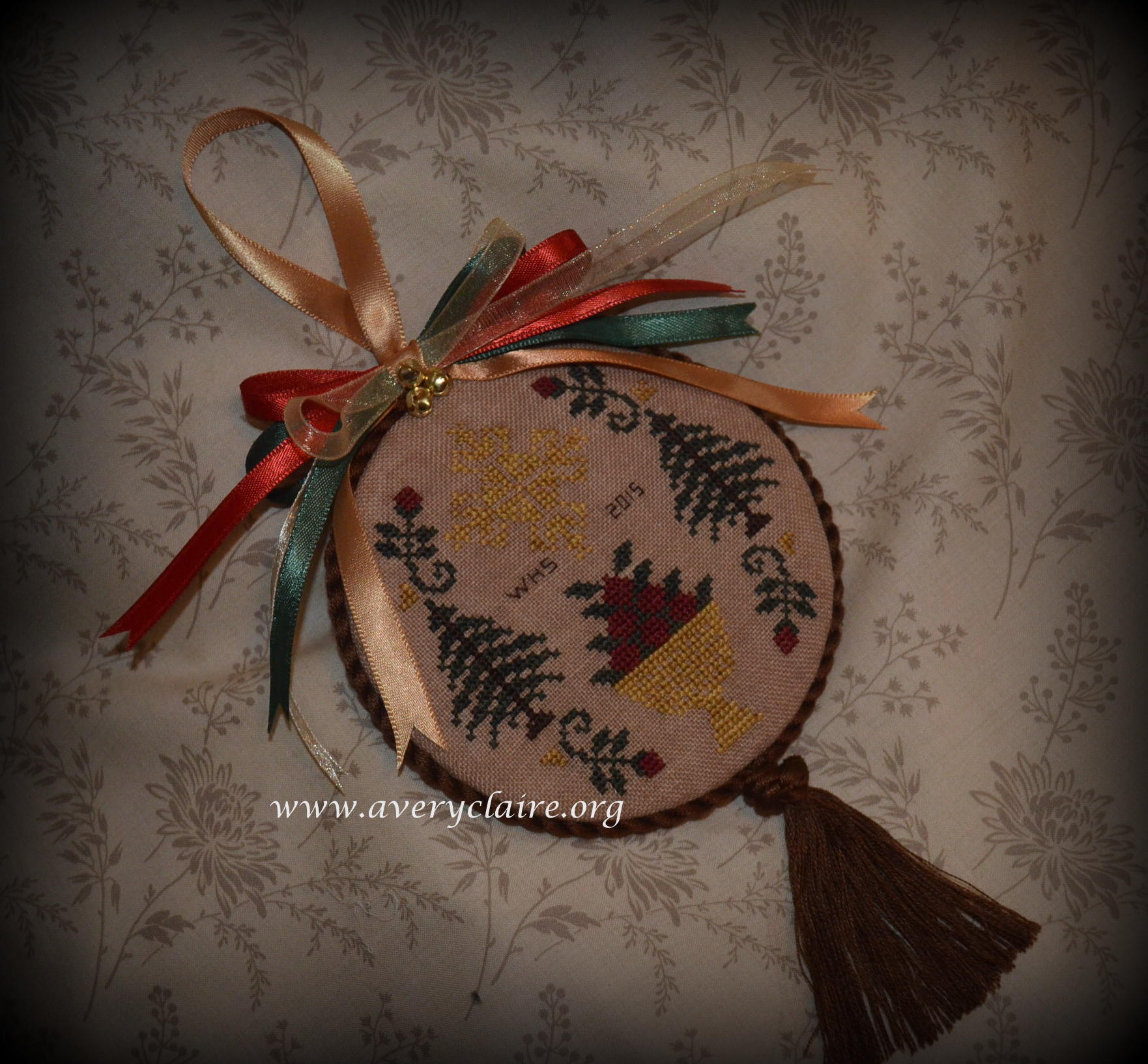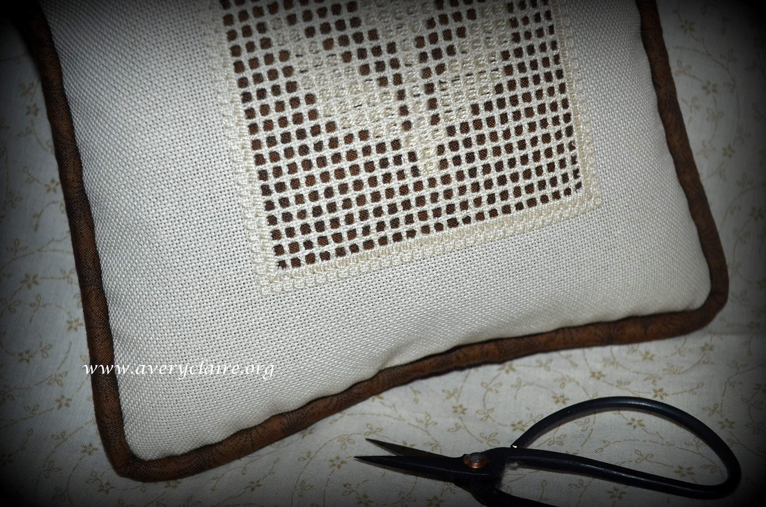 Vivian is an extraordinary quilter, but loves to do cross-stitch too. This one is called “Deck the Halls” by Stacy Nash and was made into a pinkeep filled with walnut shells by Vivian. She asked me to attach the mini pom pom trim to it after it was finished, but I like it better within the seam allowance. So I took it apart and finished it with the trim in the seam. She loved it that way.