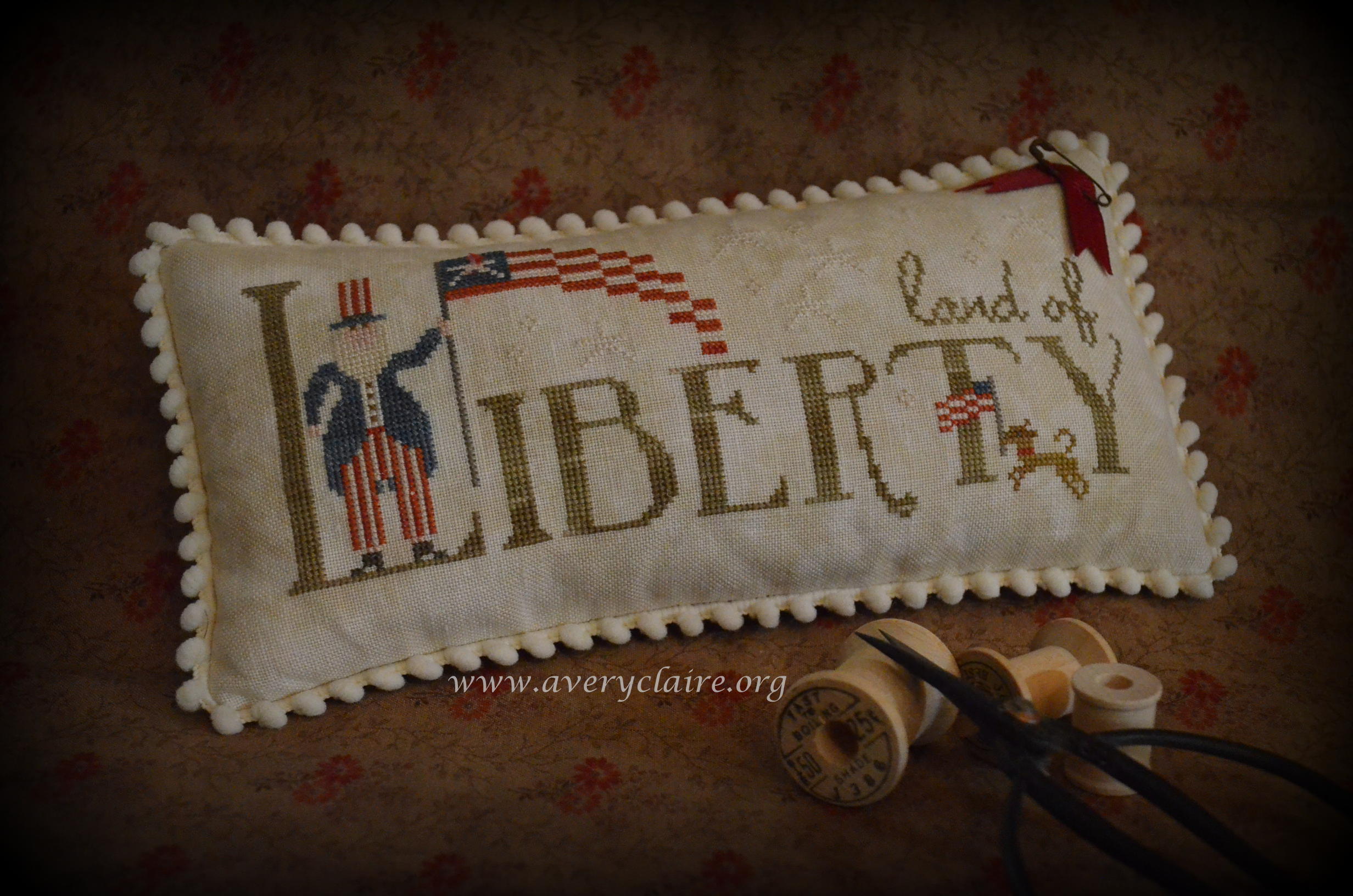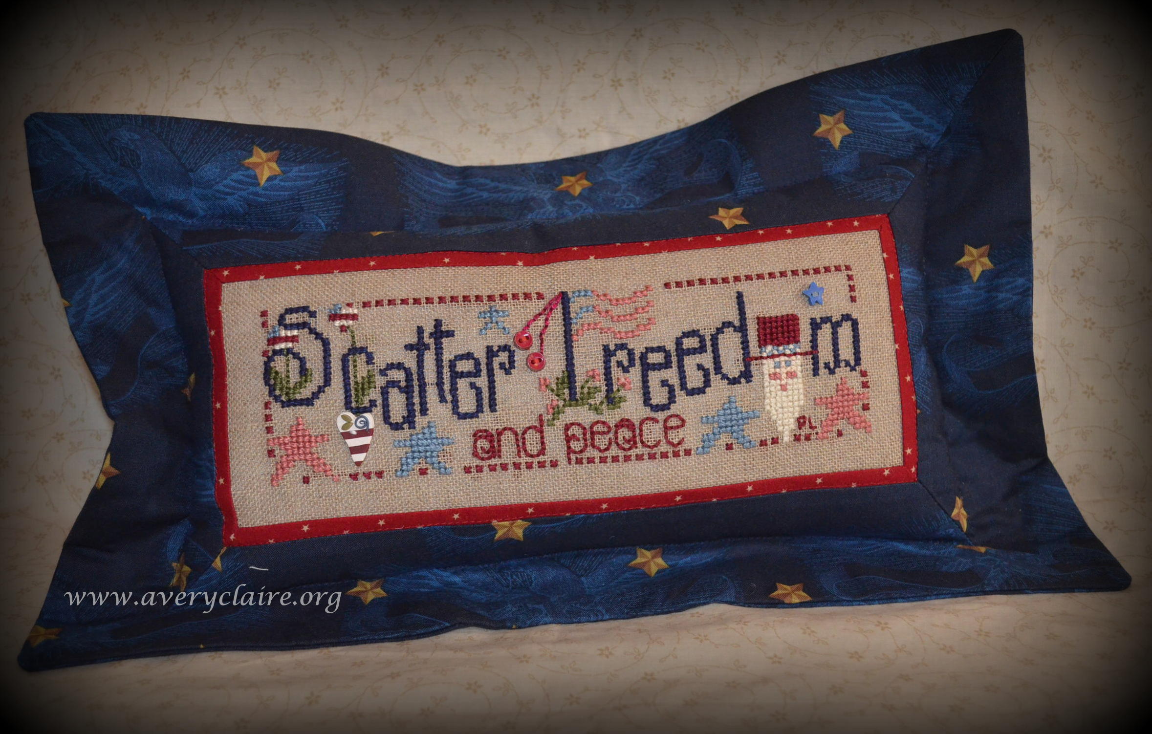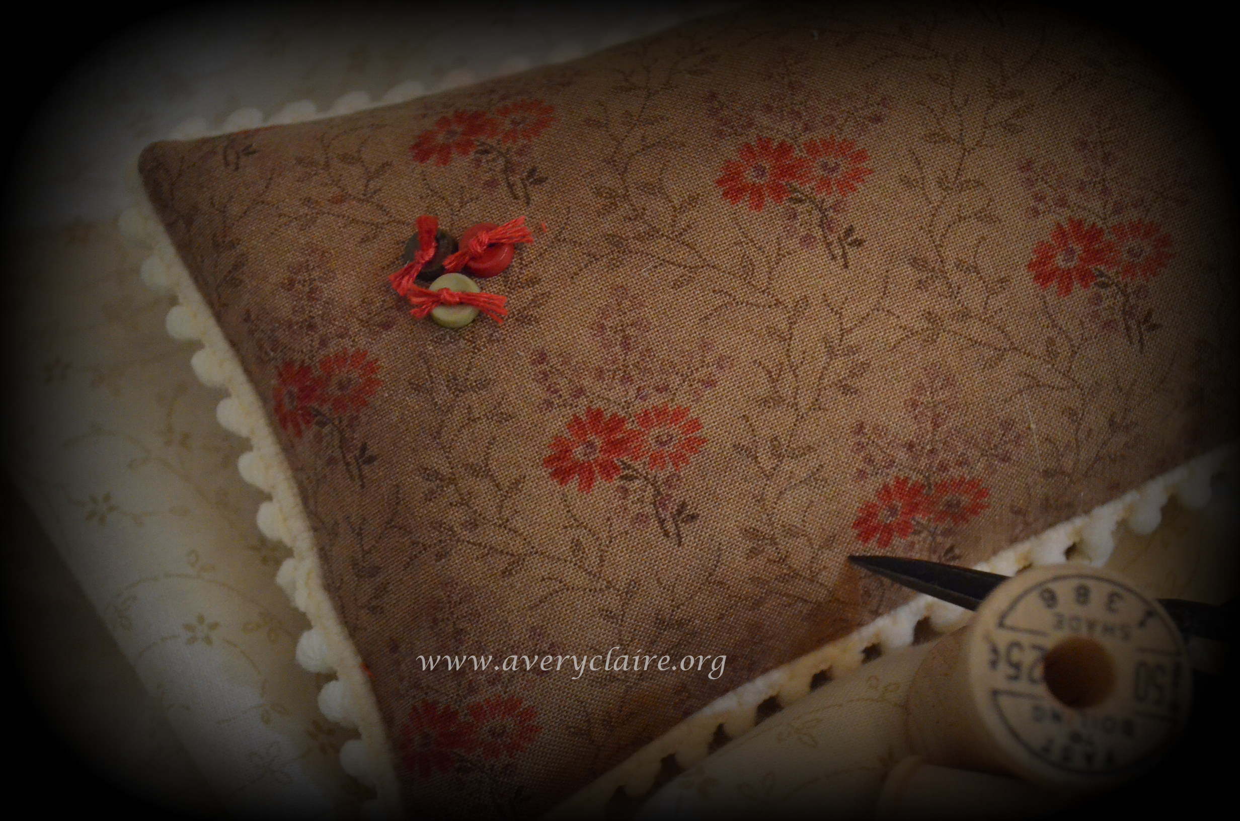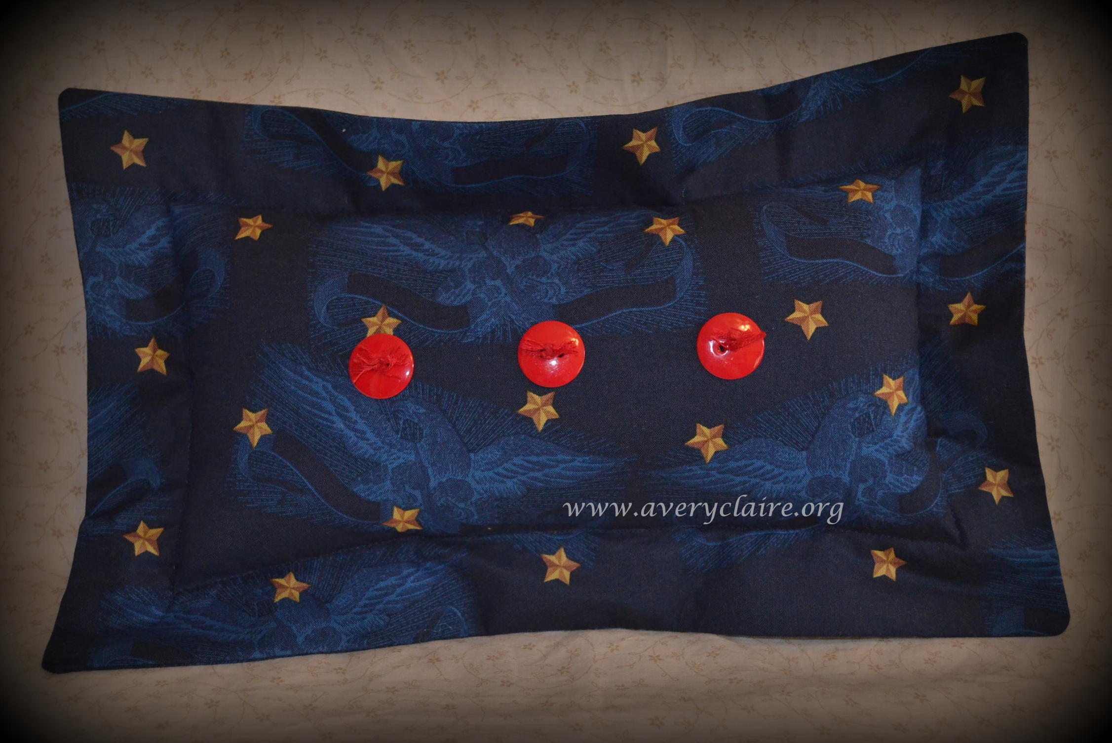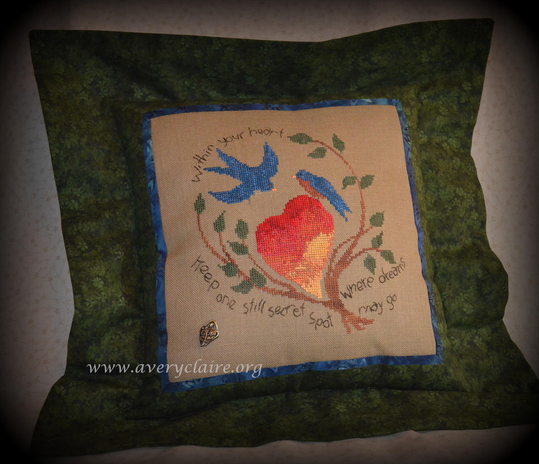 Pat requested more pillows and provided fabric for me. The first is a stunning Patriotic theme by Shepherd’s Bush to which I added three large buttons on the back. The second one is a lovely sentiment from Victoria Samplers by Cathy Jean’s Designs. I found the perfect little secret heart charm to add!