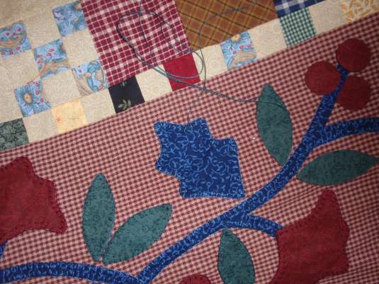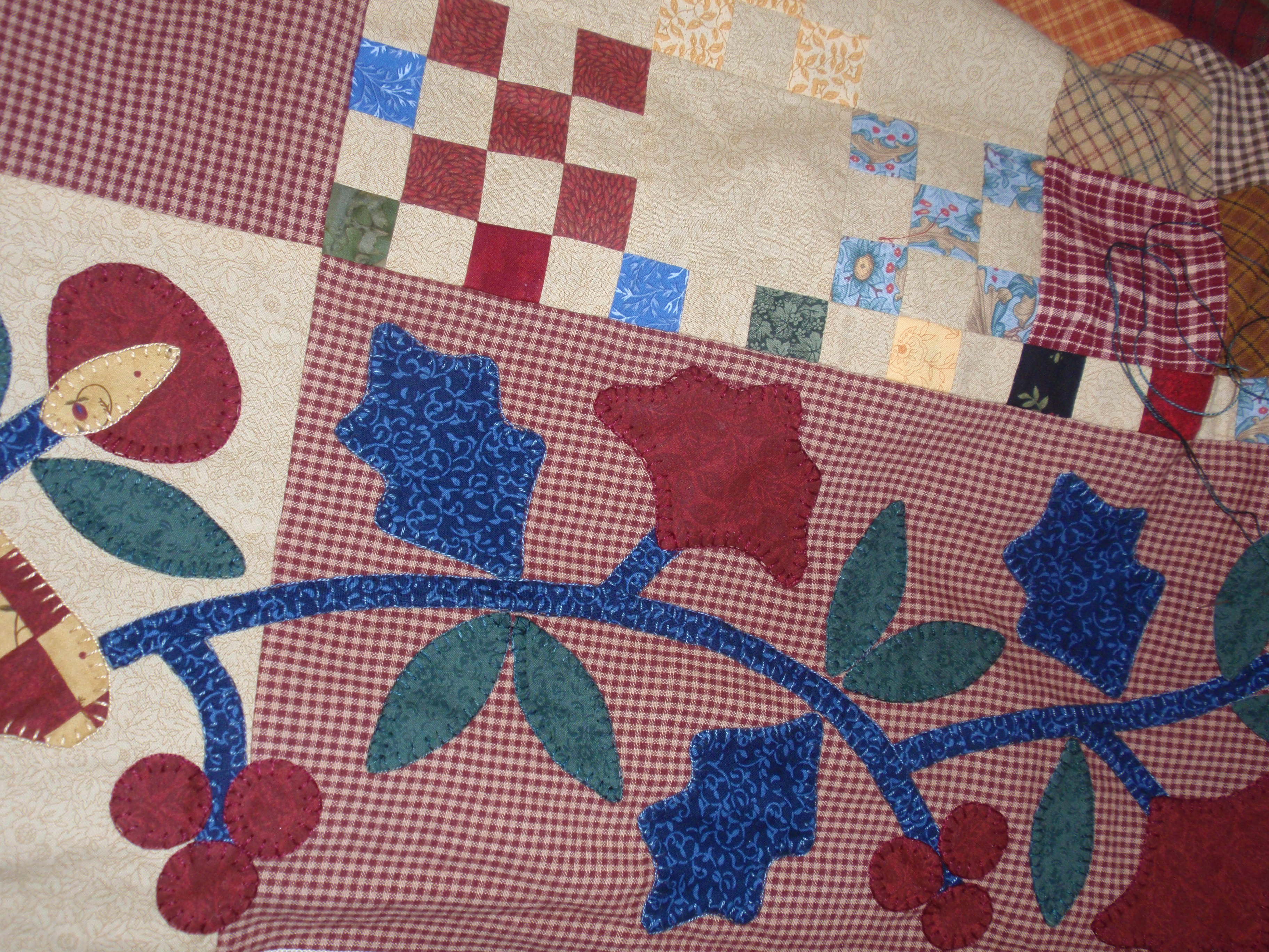 After recuperating for some weeks, I finally completed my scrappy tablecloth quilt (about 62 inches square). It is machine pieced, hand appliqued, then straight line machine quilted by me…and the applique border I free-motion quilted around the applique by adding lovely leaves whereever they would fit. I used a thin cotton batting. It is perfect on my kitchen table and will certainly warm my kitchen during Autumn.
